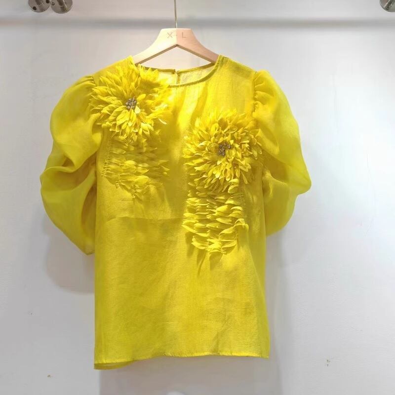 鮮やかな黄色の花柄が特徴のトップス。袖にボリュームがあるデザイン。