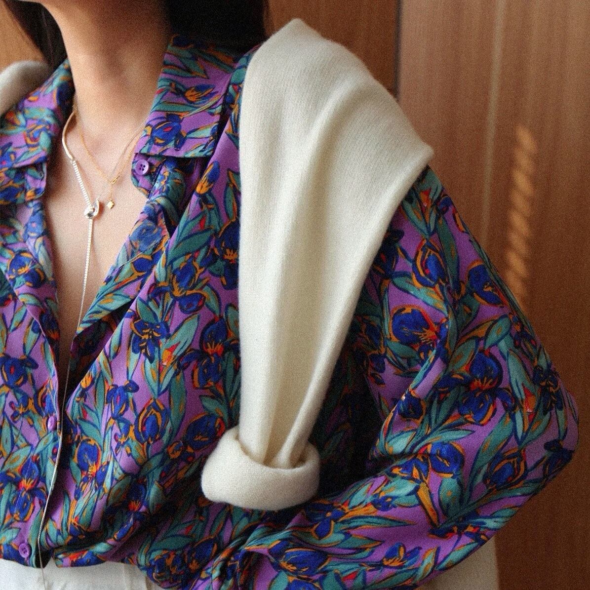 華やかなwisteria bloom french vintage purple print loose blouse。