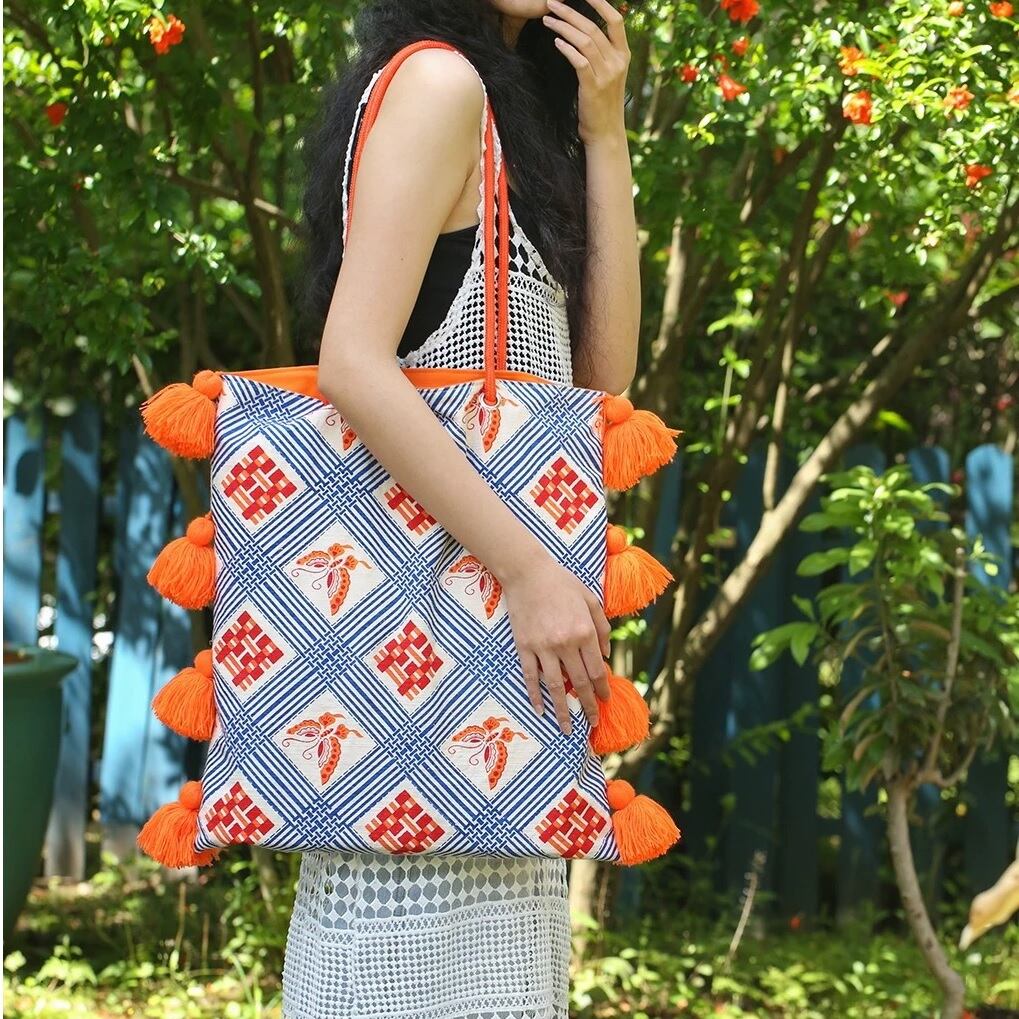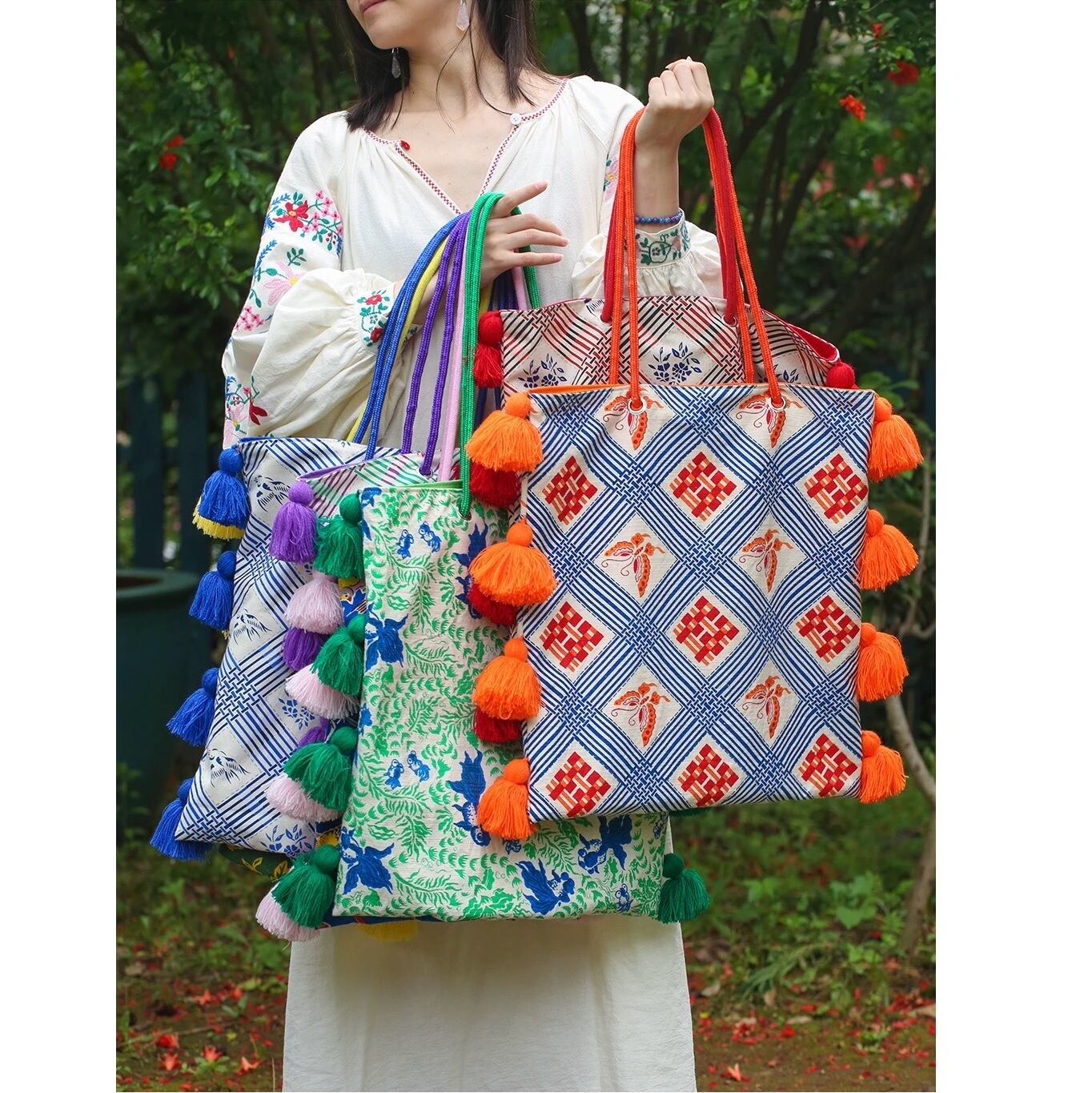 ノスタルジックなcolor-block tassel canvas tote。