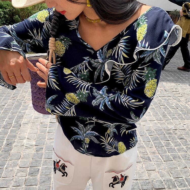 リュクスな印象を与えるfrilled botanical V-neck blouse。