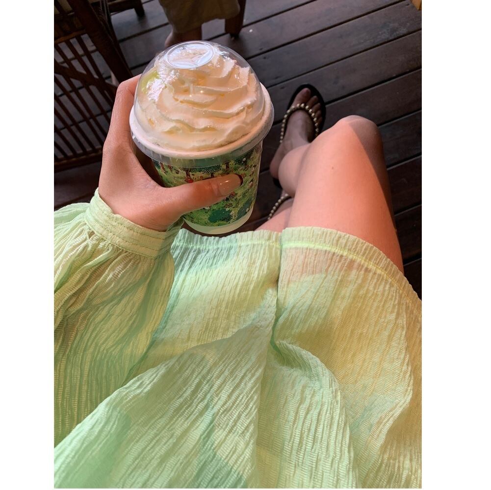 鮮やかなgreen two-piece set top and wide-leg shorts。