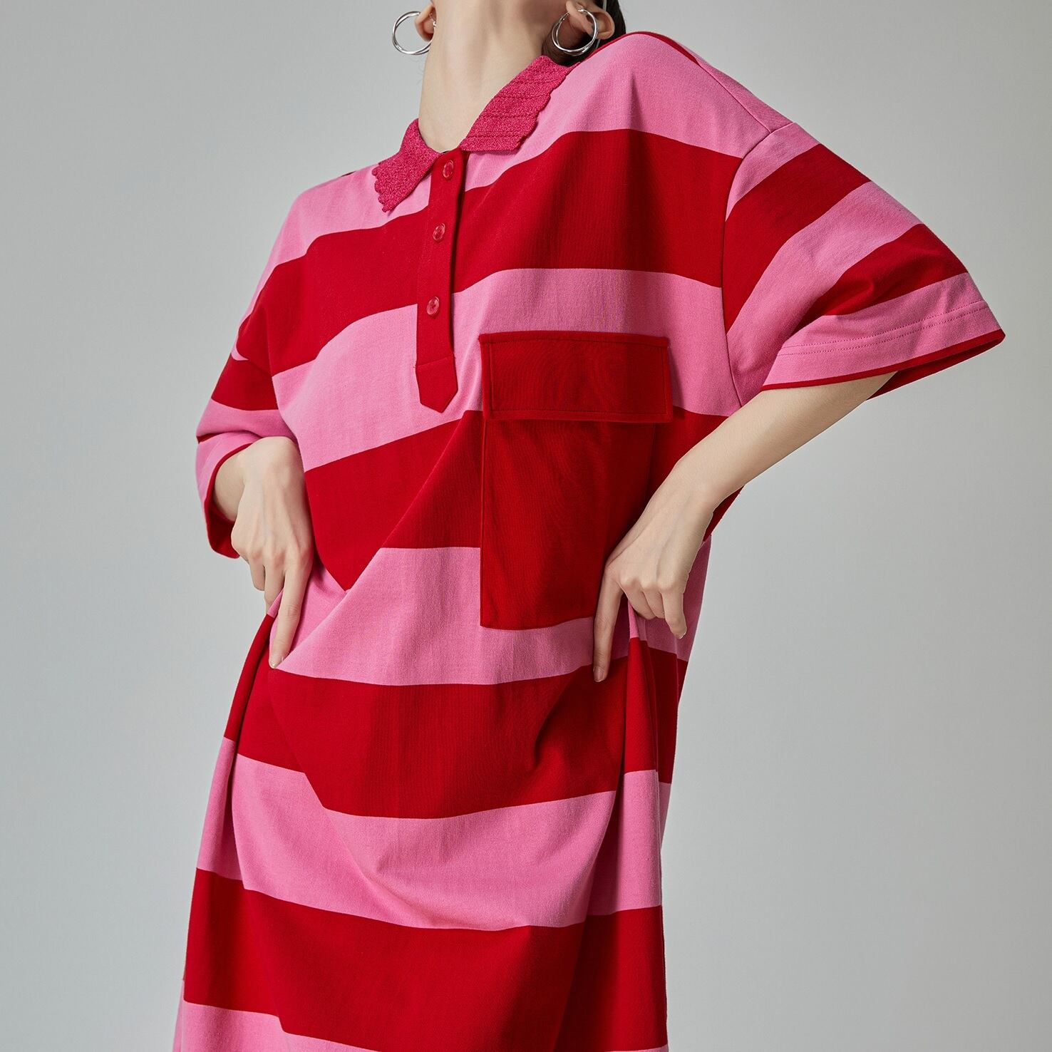 鮮やかなストライプが魅力的なpink striped short-sleeve t-shirt dress。