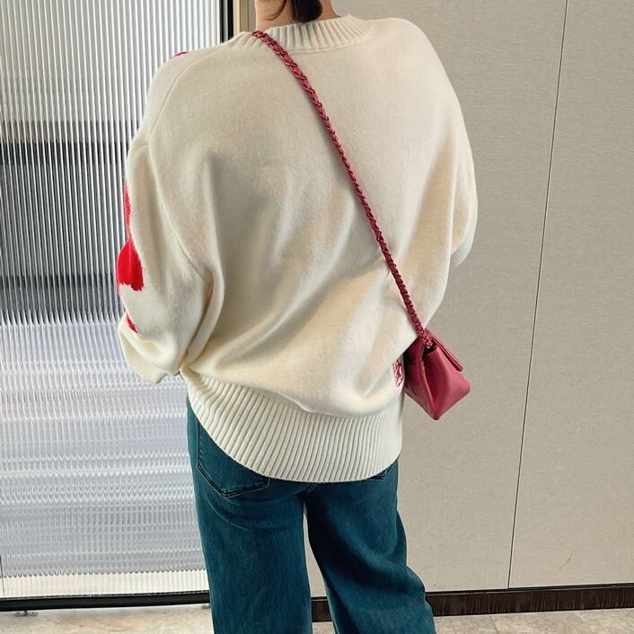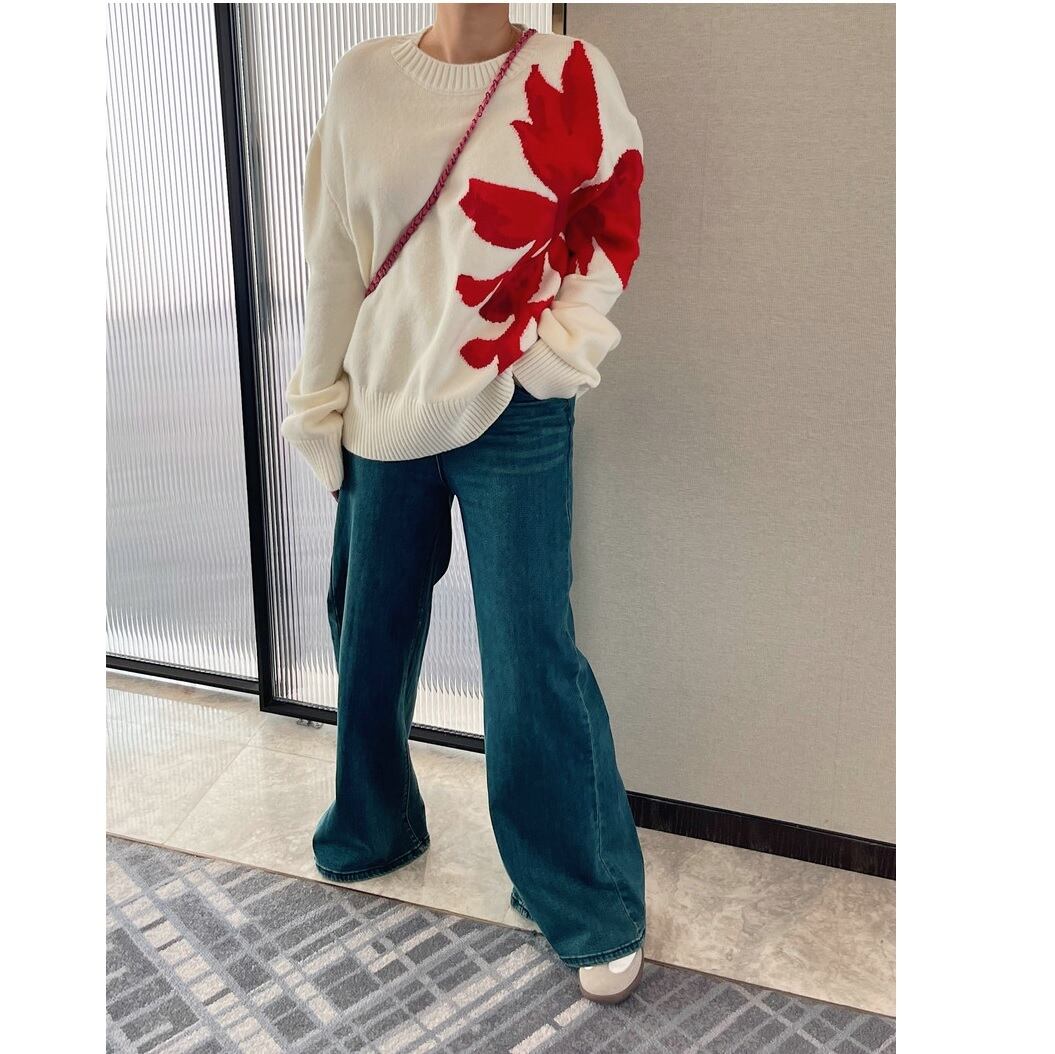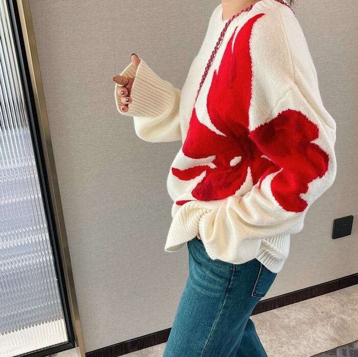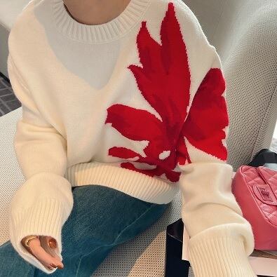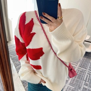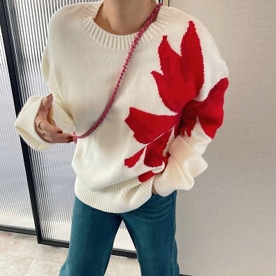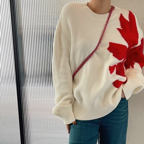 鮮やかなメープルリーフ柄が印象的なmaple leaf pullover sweater。