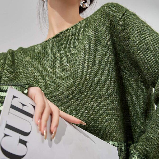 華やかなグリーンのスパンコールが輝くgreen sequin knit top。