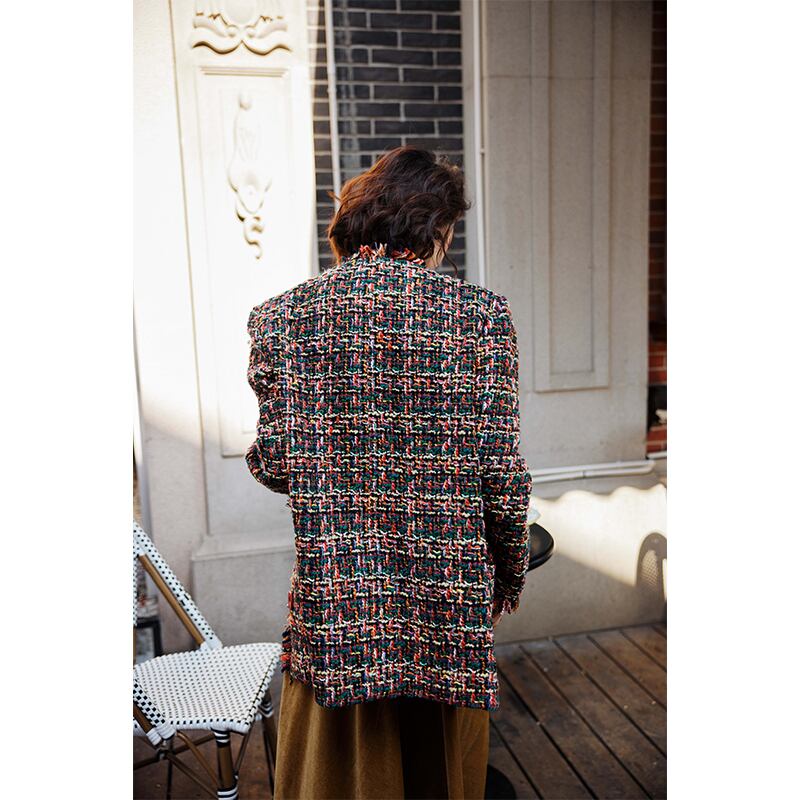 赤ボタンがアクセントのred-button tweed round-neck jacket。
