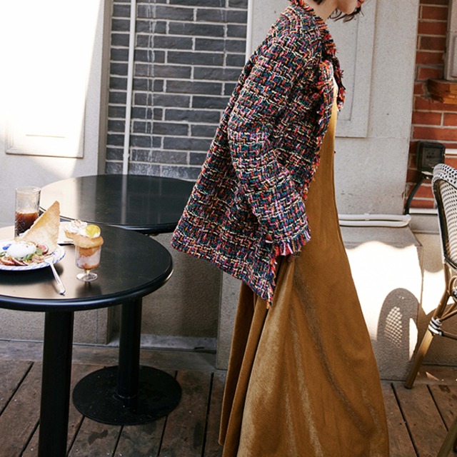 クラシックで上品な華やぎを演出。シンプルなブラウスやタートルネックに羽織れば、瞬時に洗練された印象に仕上がり、ワンピースの上からでもバランスよく決まります。