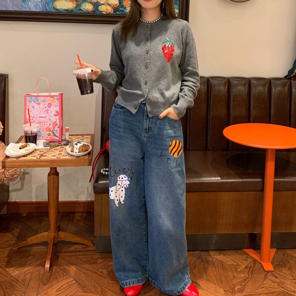 デニムに愛らしいプードルが可愛いpoodle print denim wide pants。