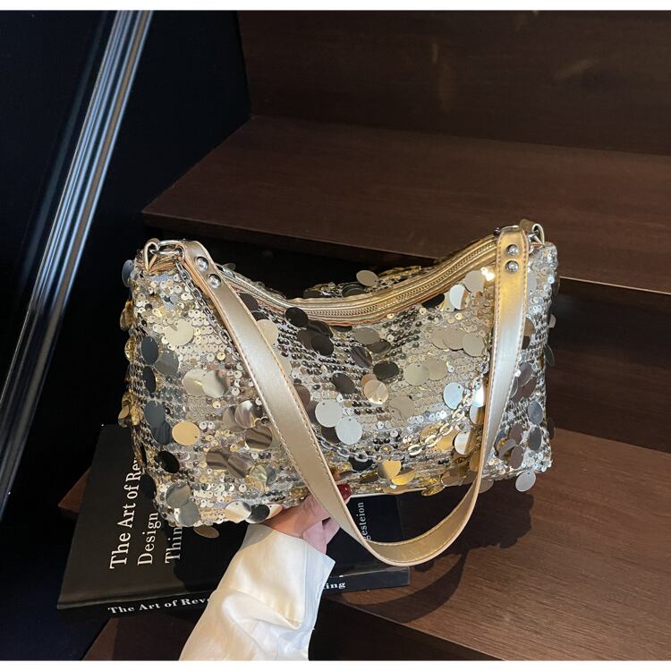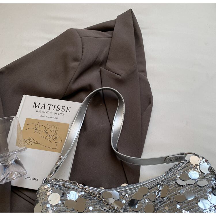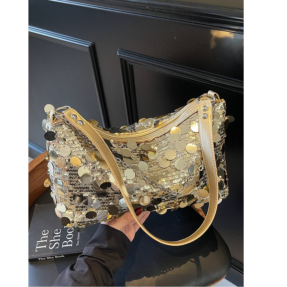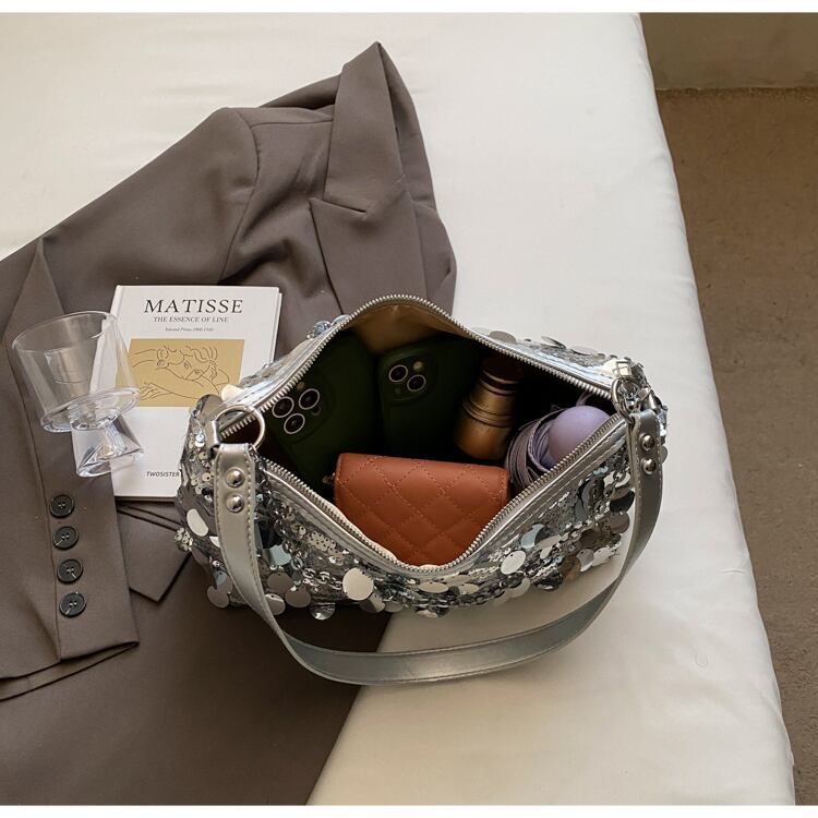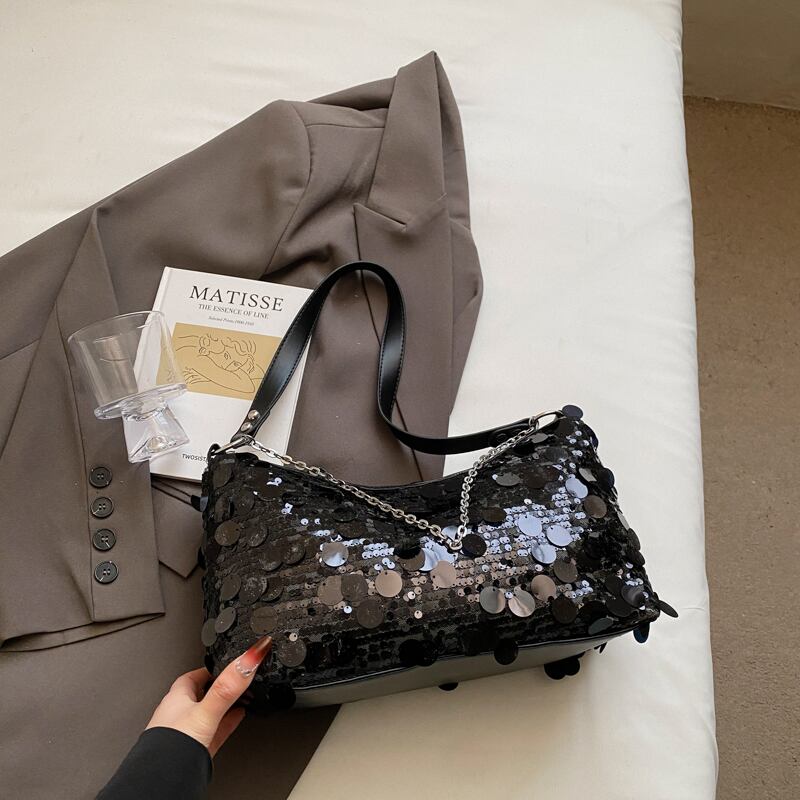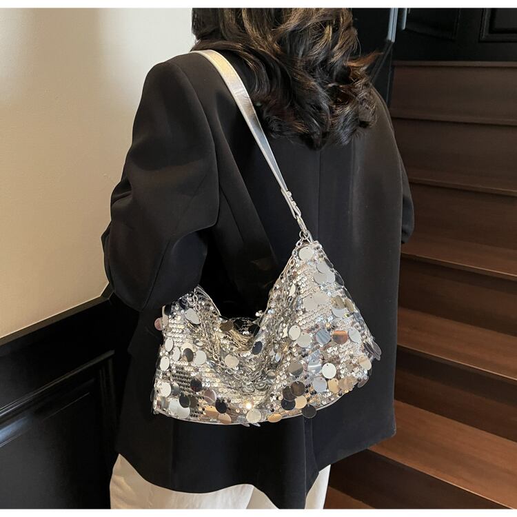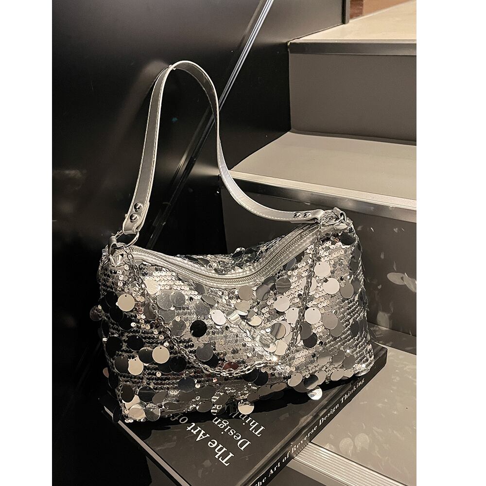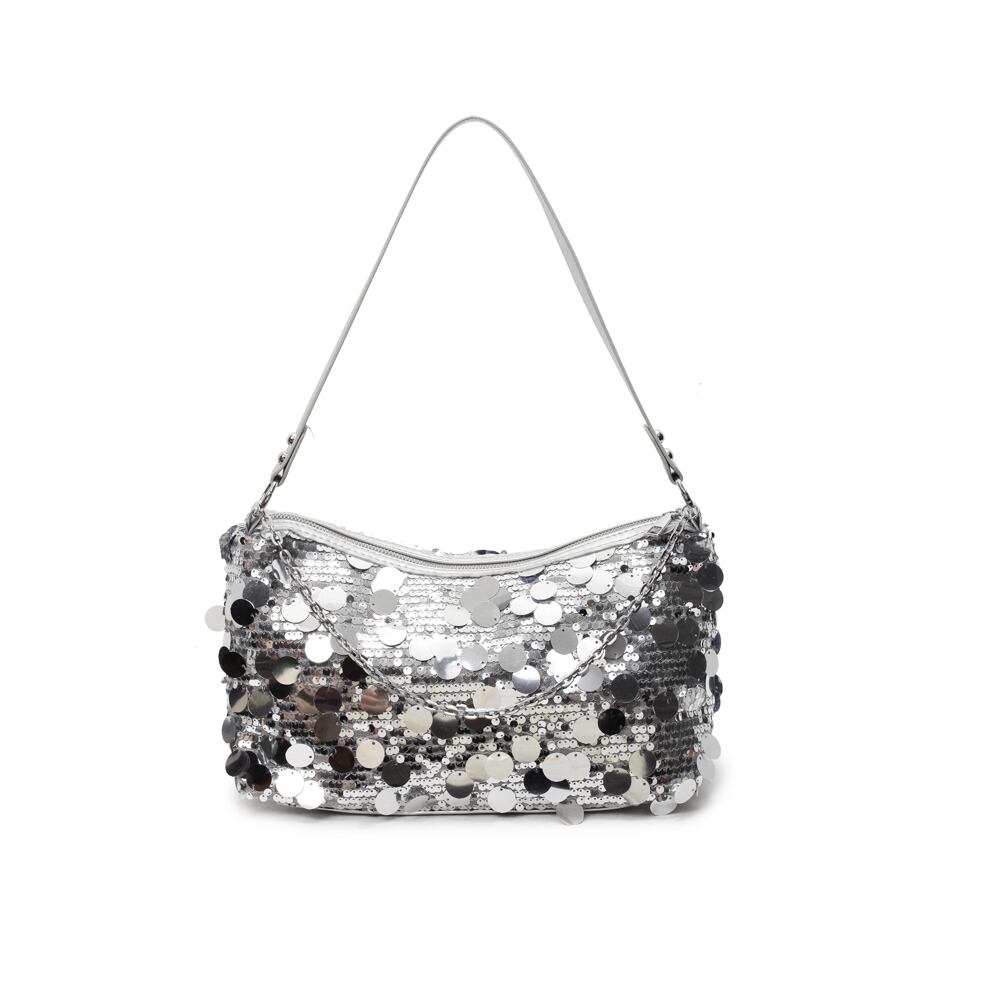 モードな印象をプラスしてくれるsparkly sequin underarm bag。