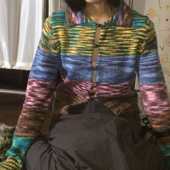 rainbow contrast hollow knit cropped cardigan〈t1461〉