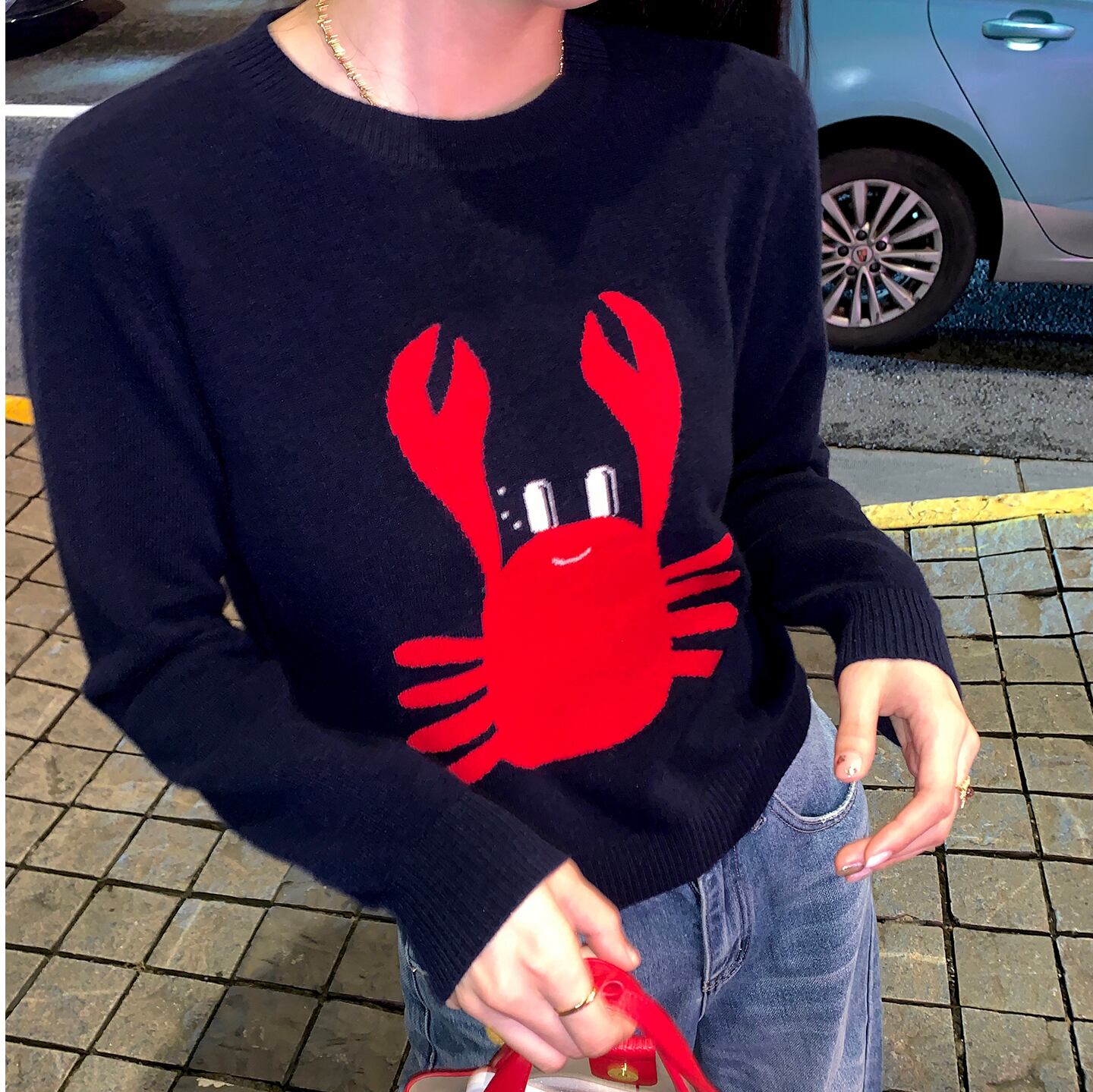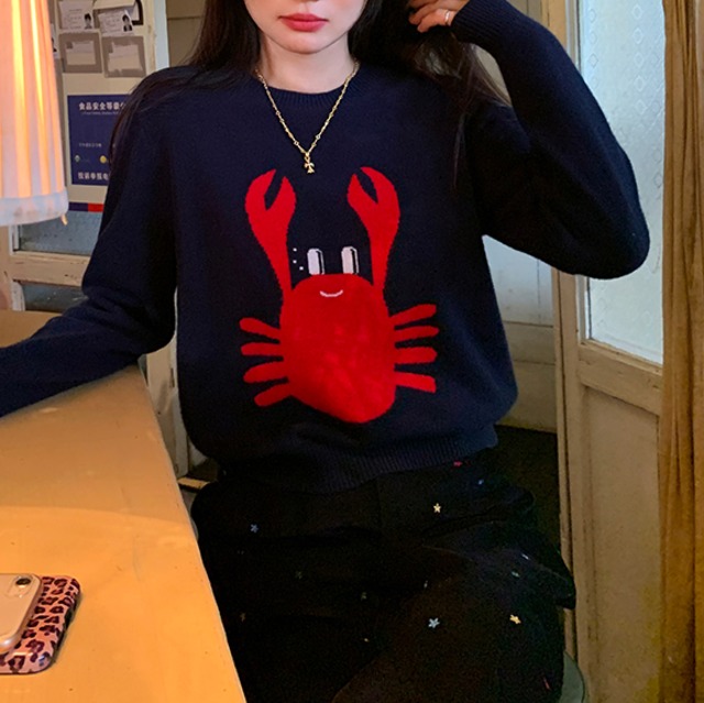 真っ赤なカニさんの刺繍が個性的なニット。