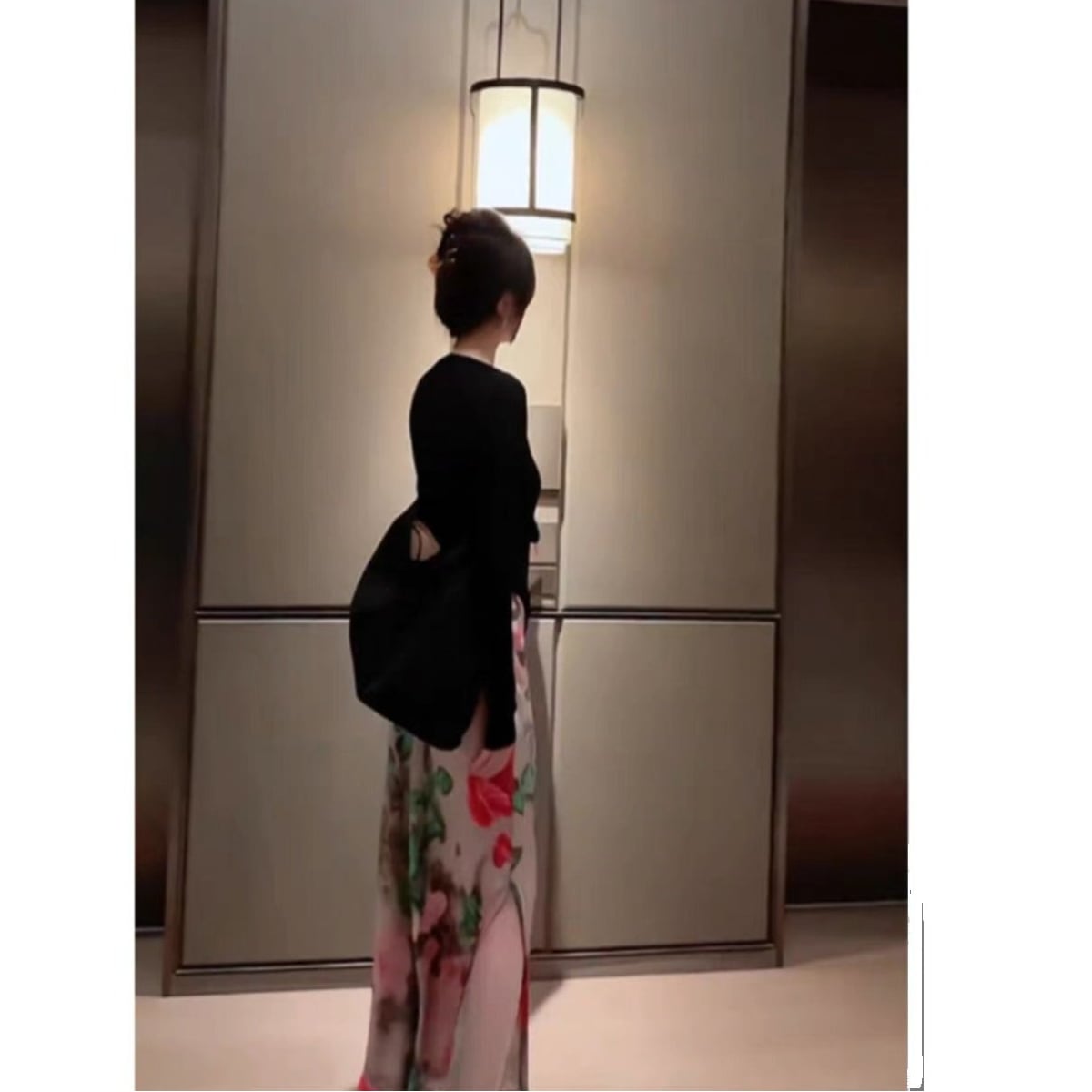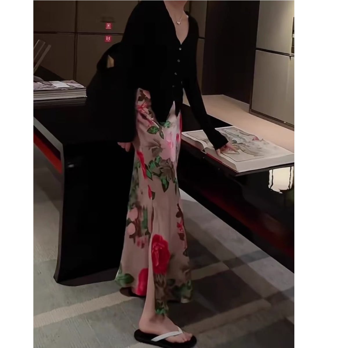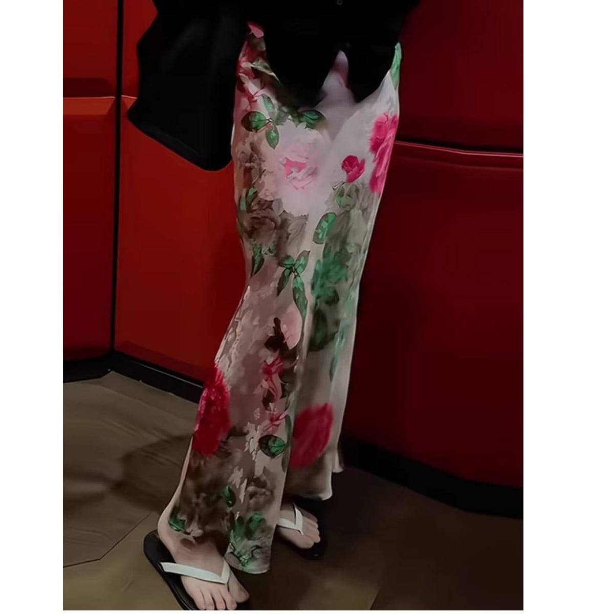 優しい風に揺れる花々が、まるで古い絵本から飛び出してきたようなロマンティックな一着。歩くたびに花びらが舞うような可憐な印象を残します。