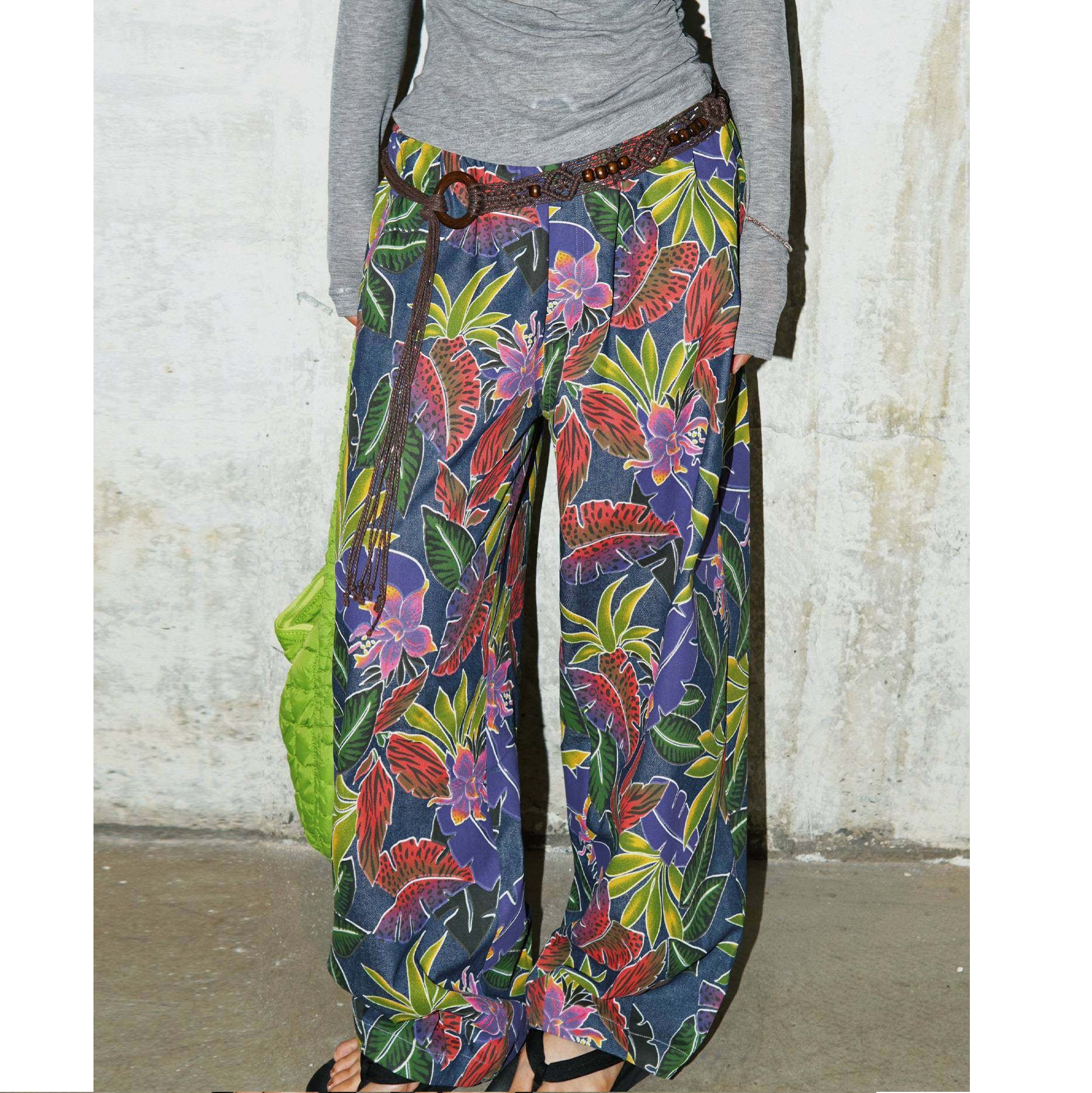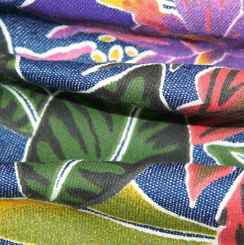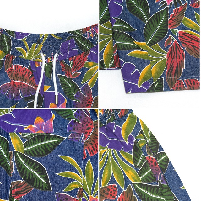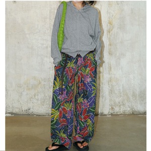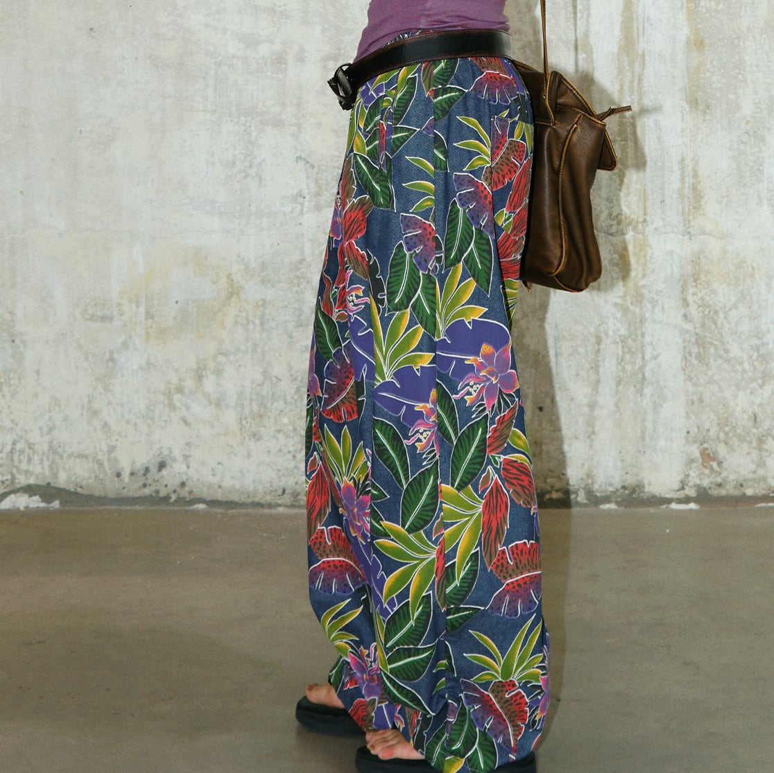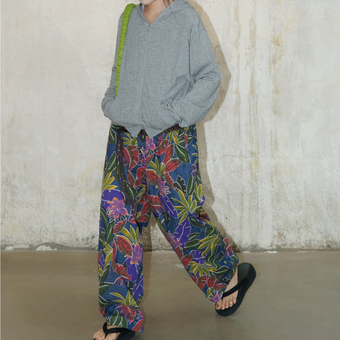 神秘的な紫の花々が咲き誇る、purple floral print elastic waist denim pants。
