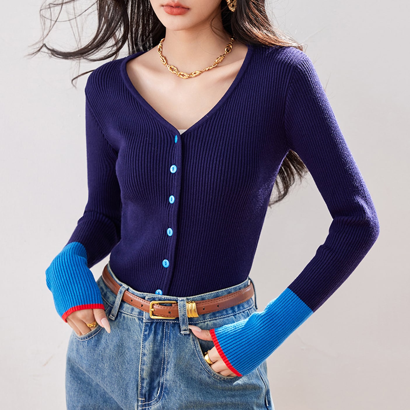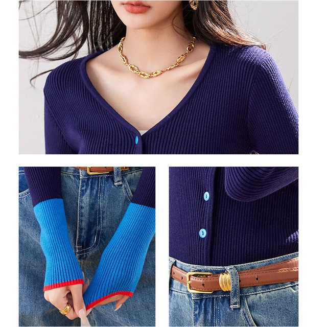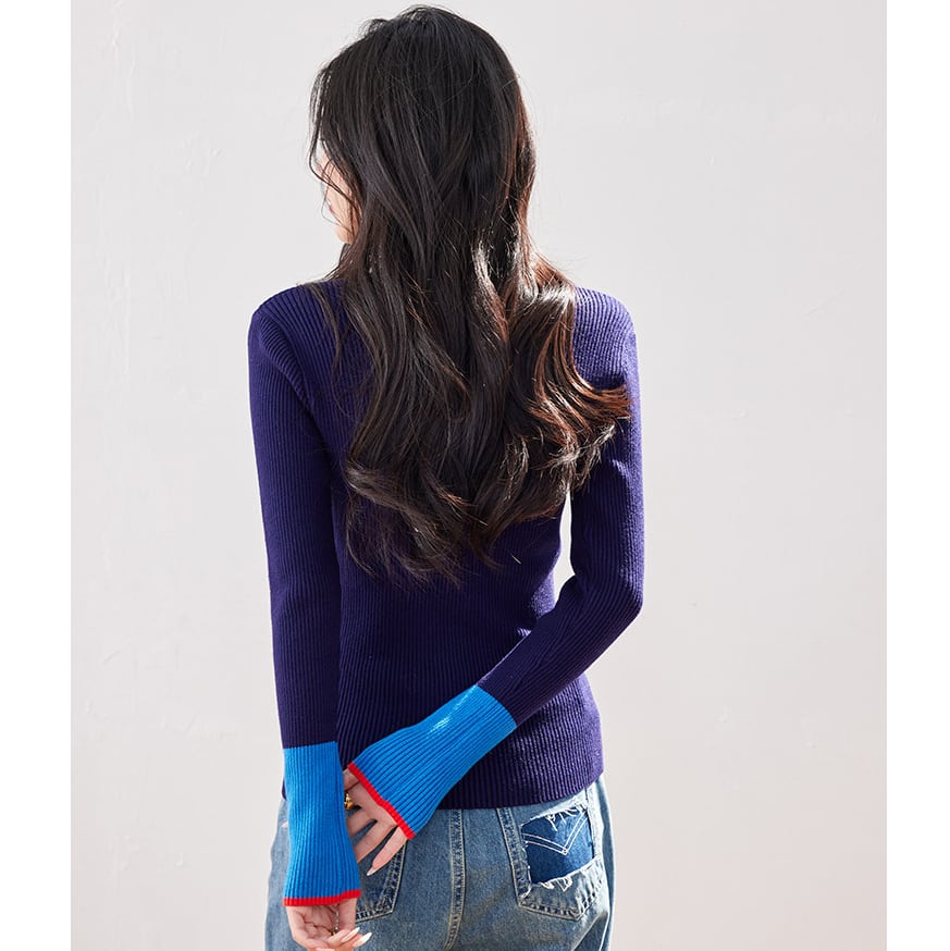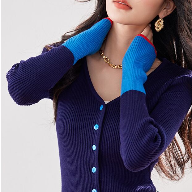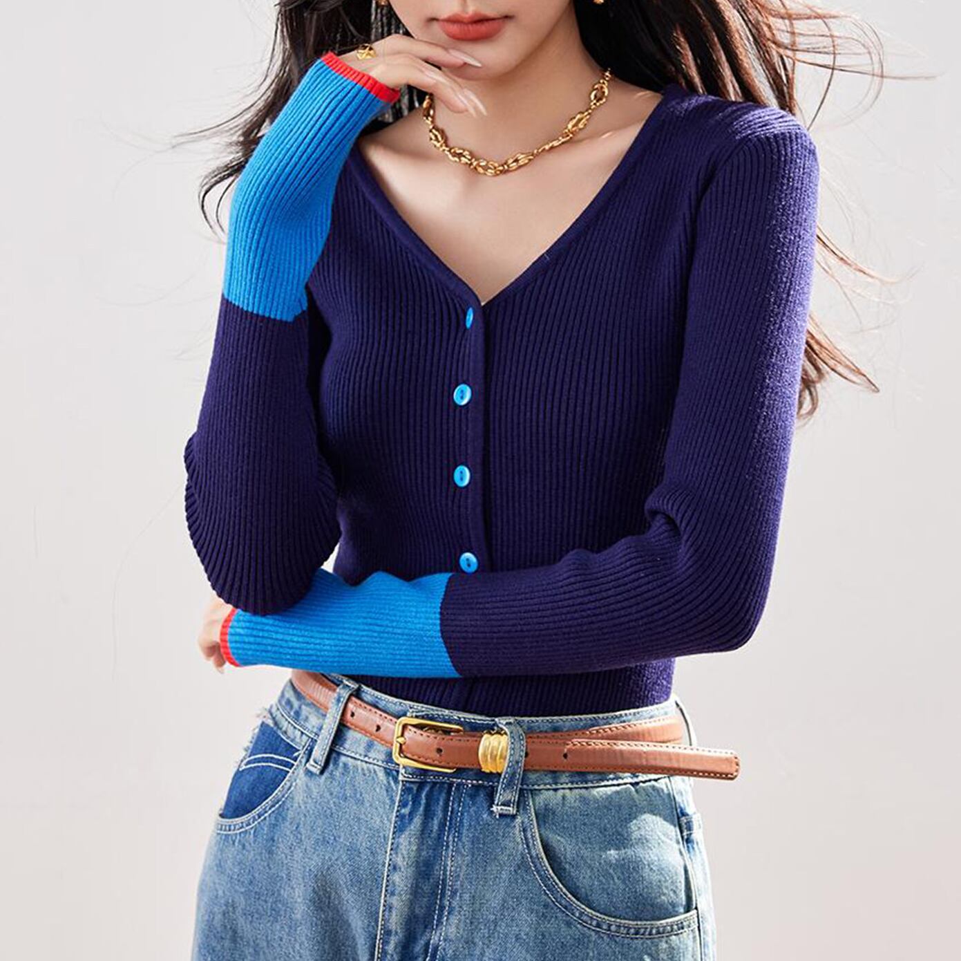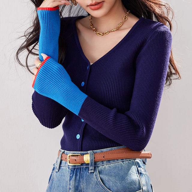 ネイビーを基調にしたカラーブロックが目を惹く、navy color block button-up knit top。