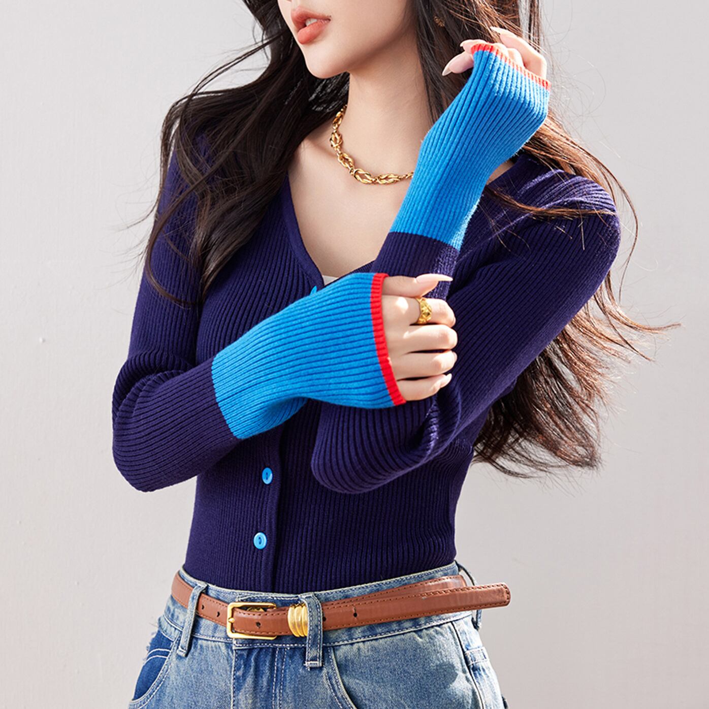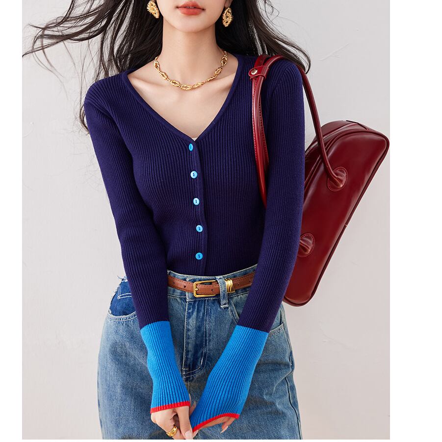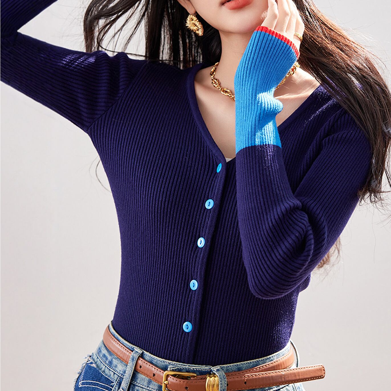 ネイビーを基調にしたカラーブロックが目を惹く、navy color block button-up knit top。