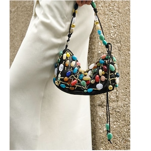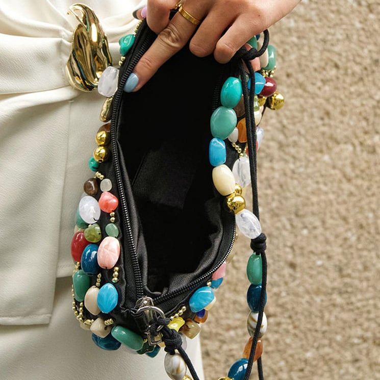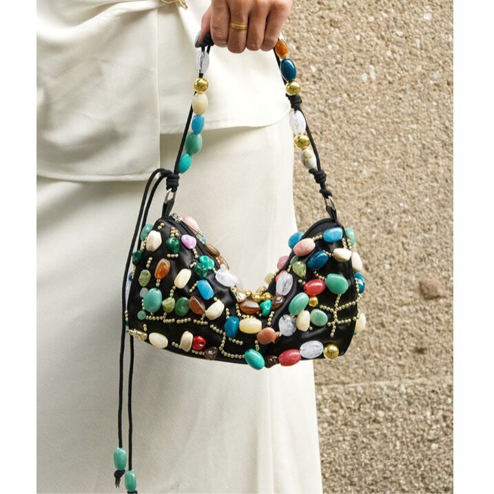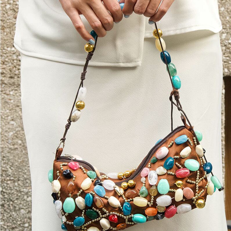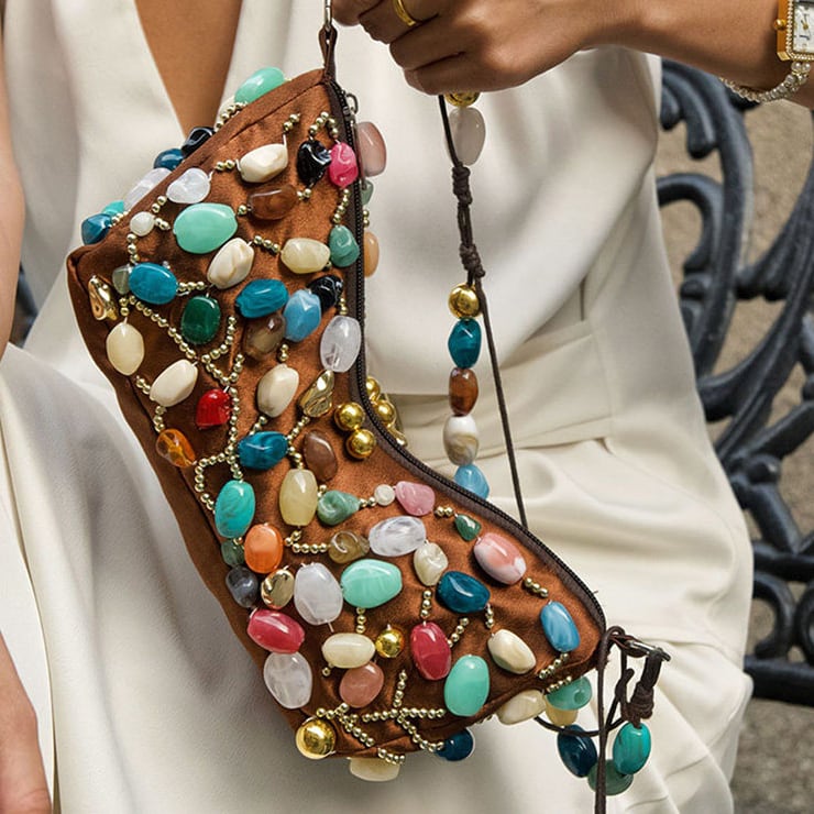 光沢のあるサテンに美しいジェムが輝くクラッチバッグ。