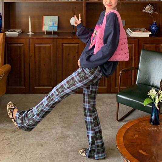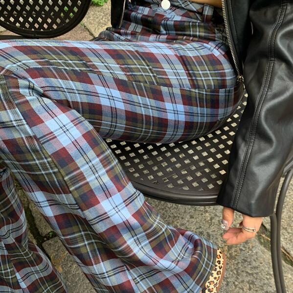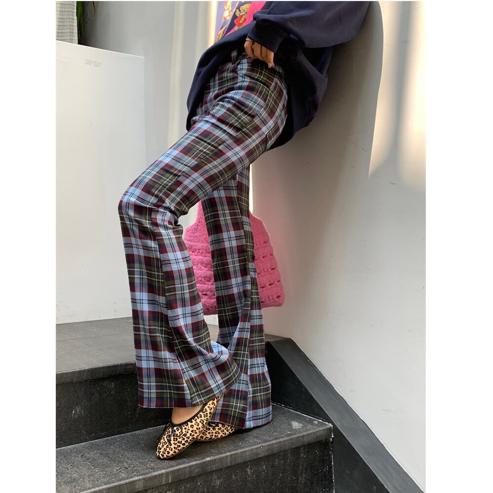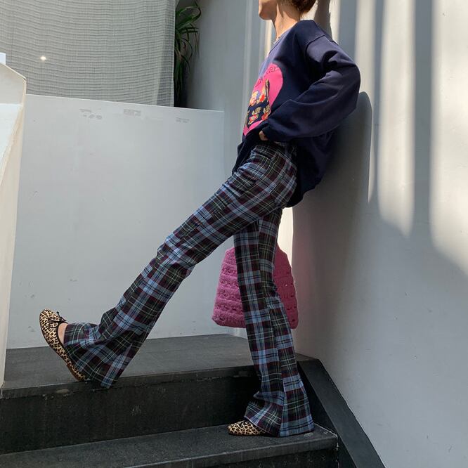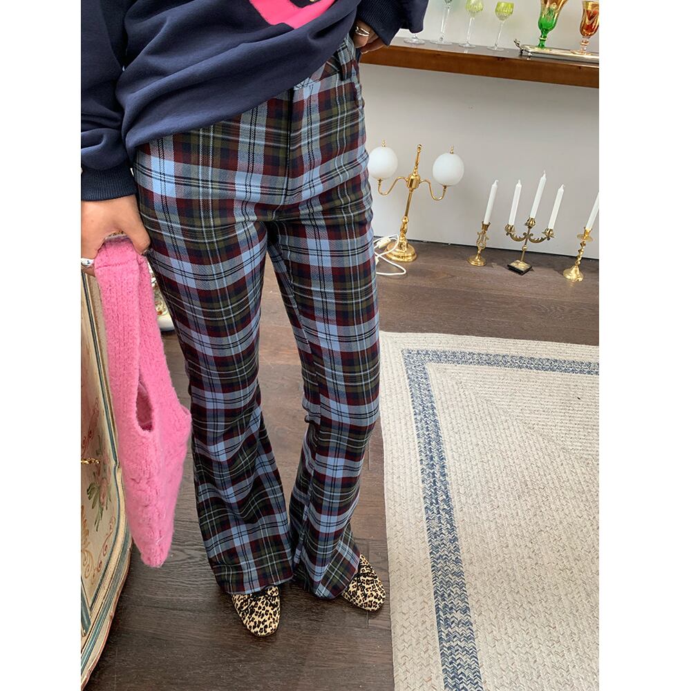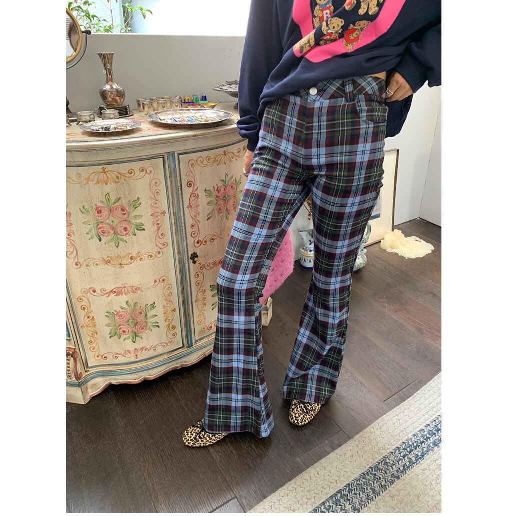 クラシックなチェック柄が目を惹く blue plaid flare pants。