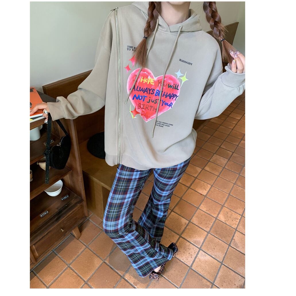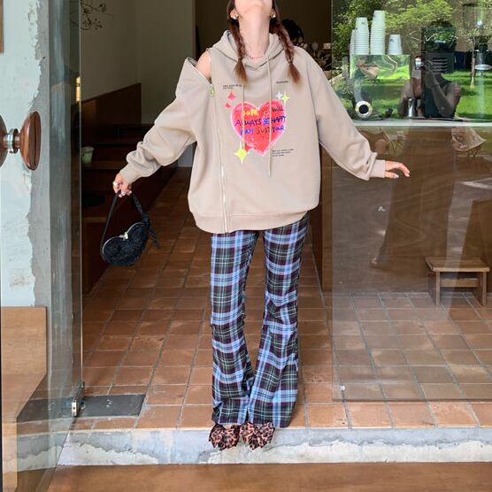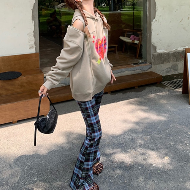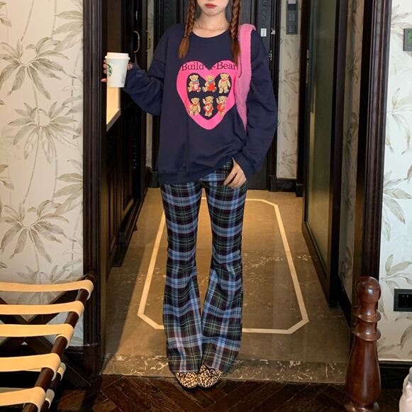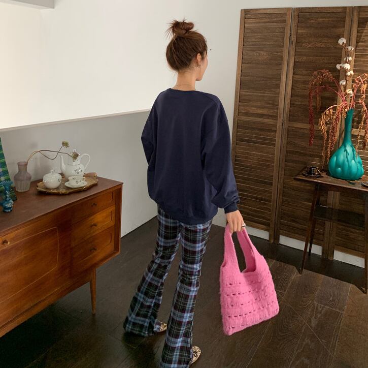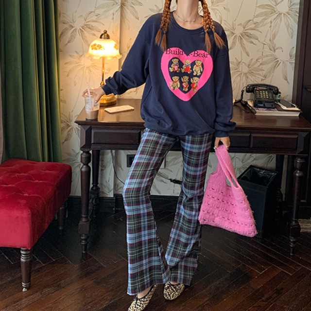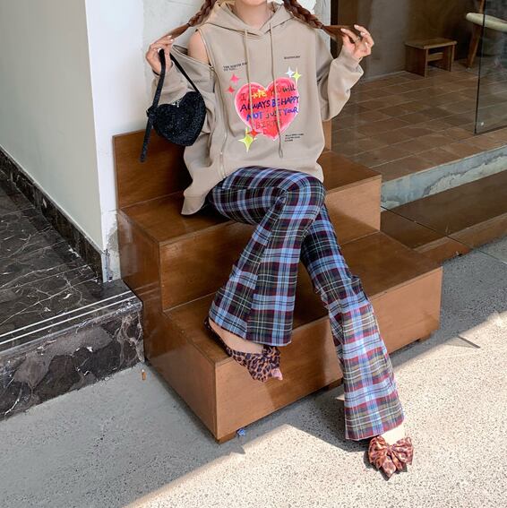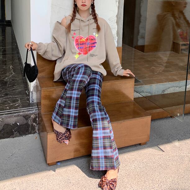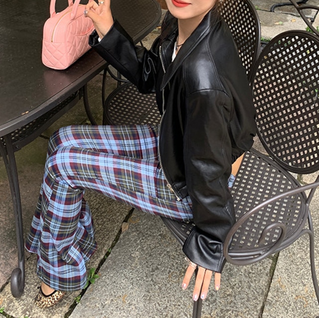 クラシックなチェック柄が目を惹く blue plaid flare pants。