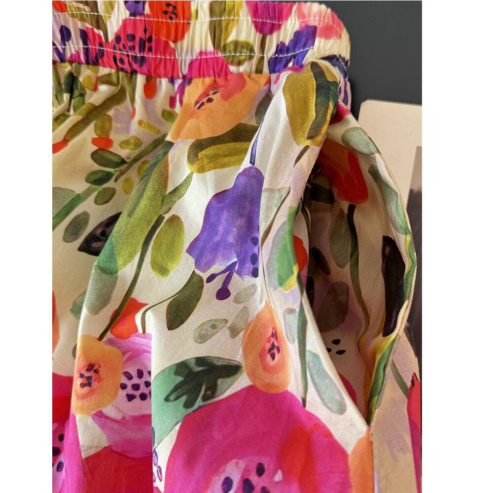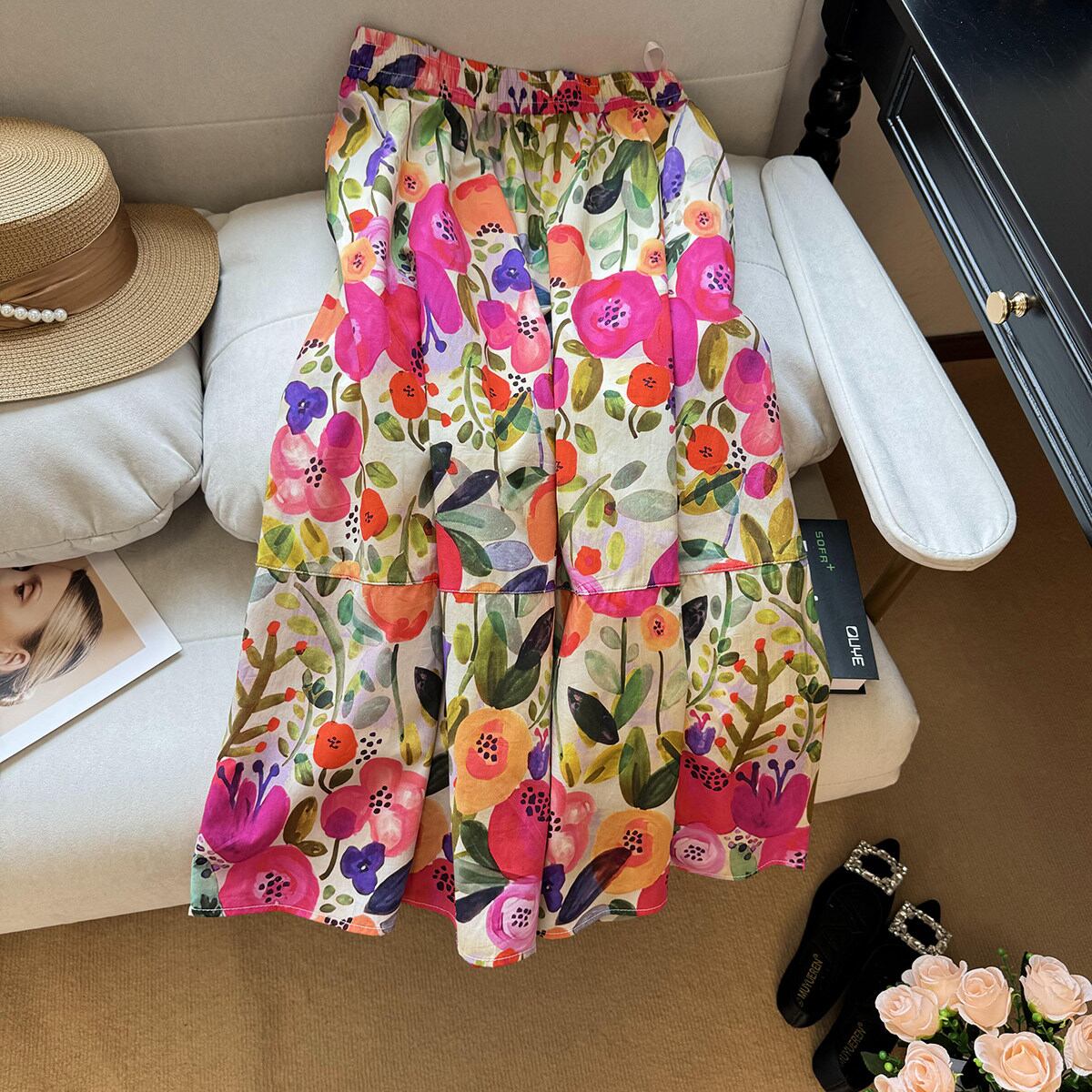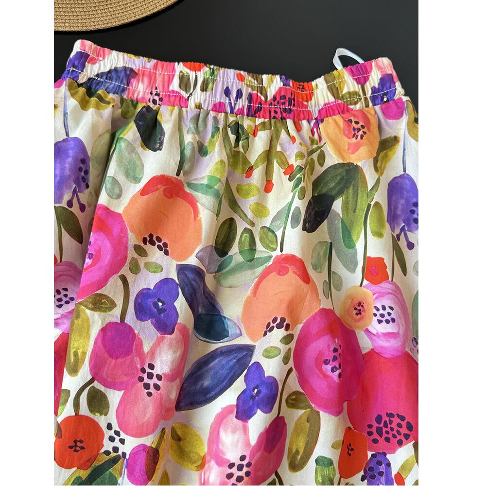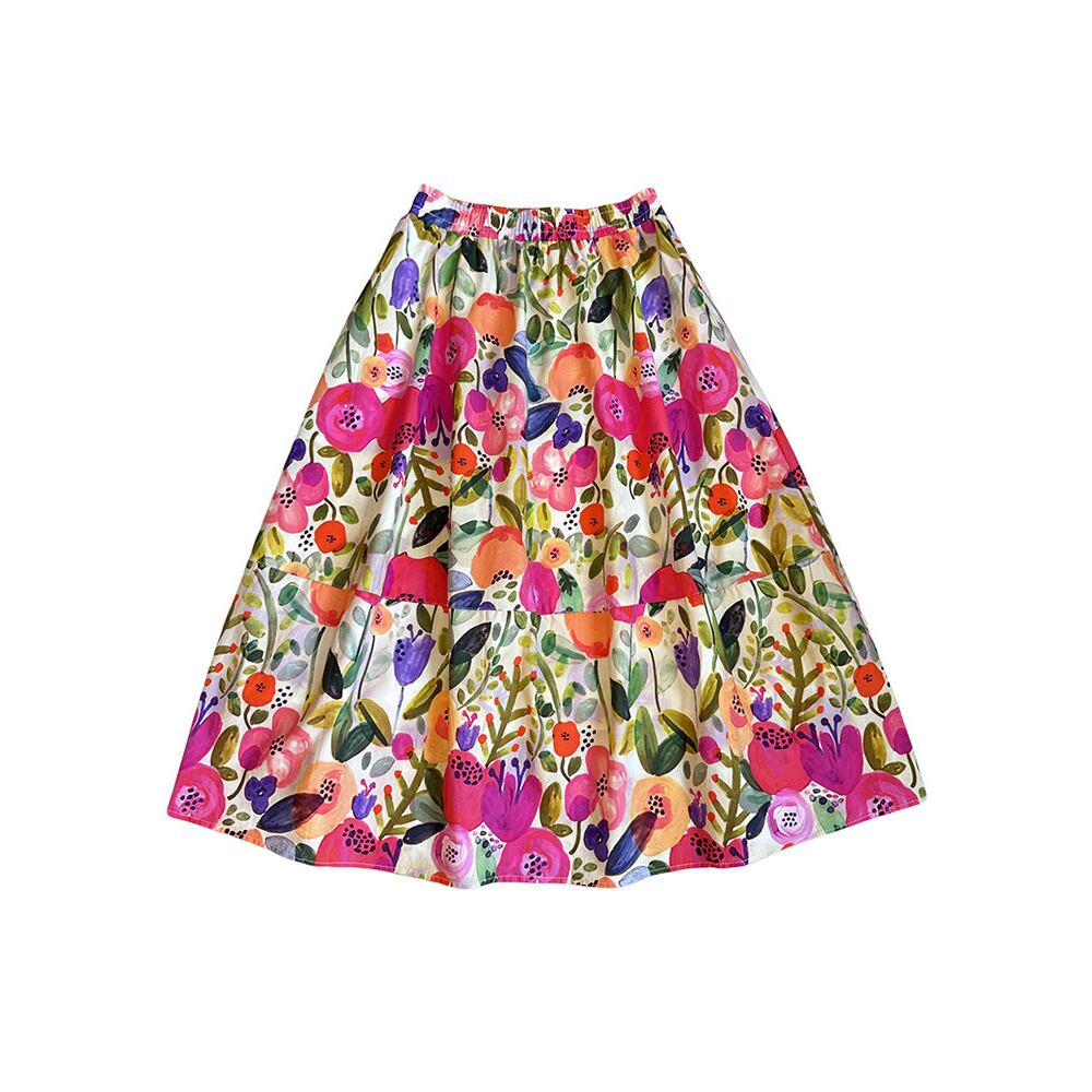 まるでアートのようなオイルペイント風フラワー柄が魅力のミディスカート。