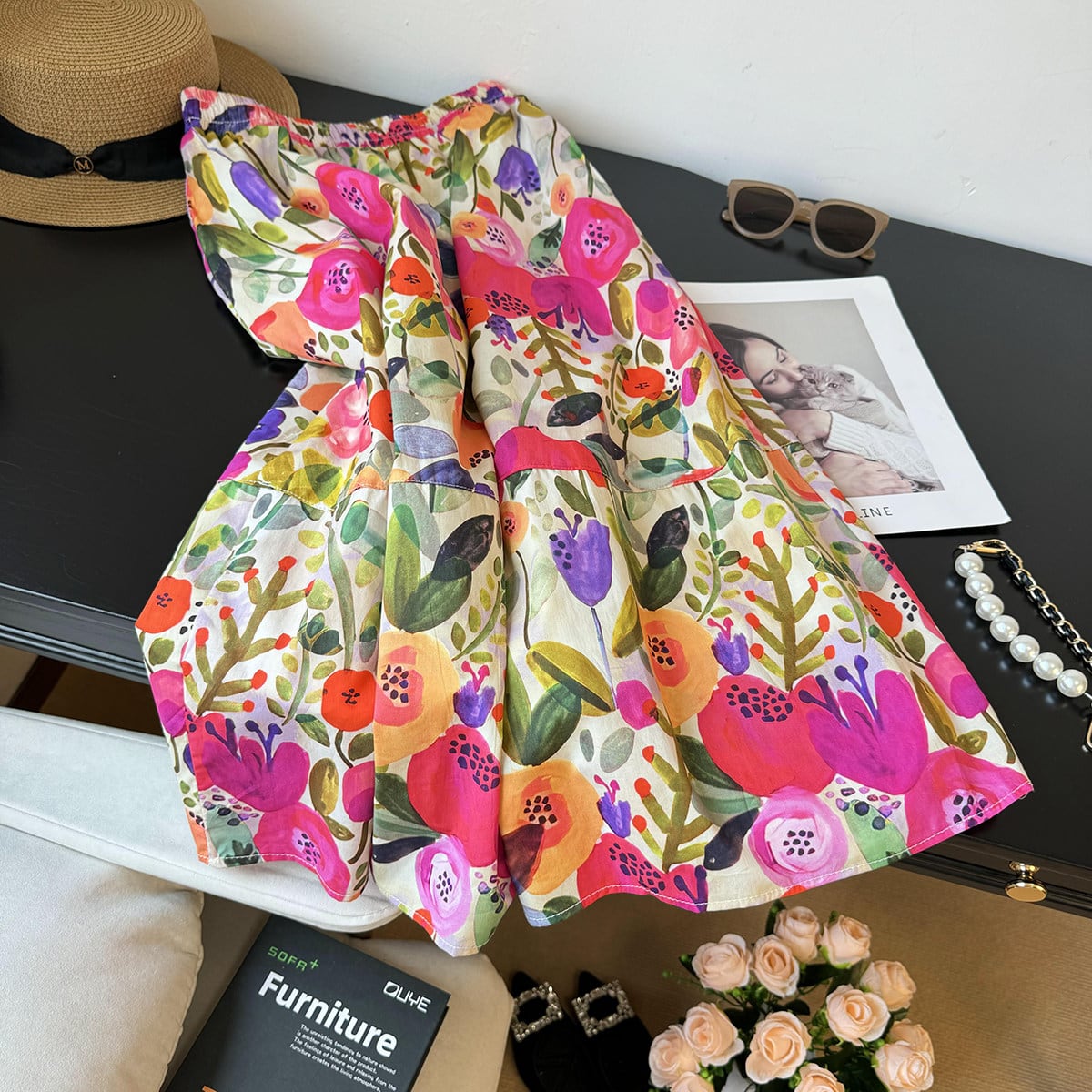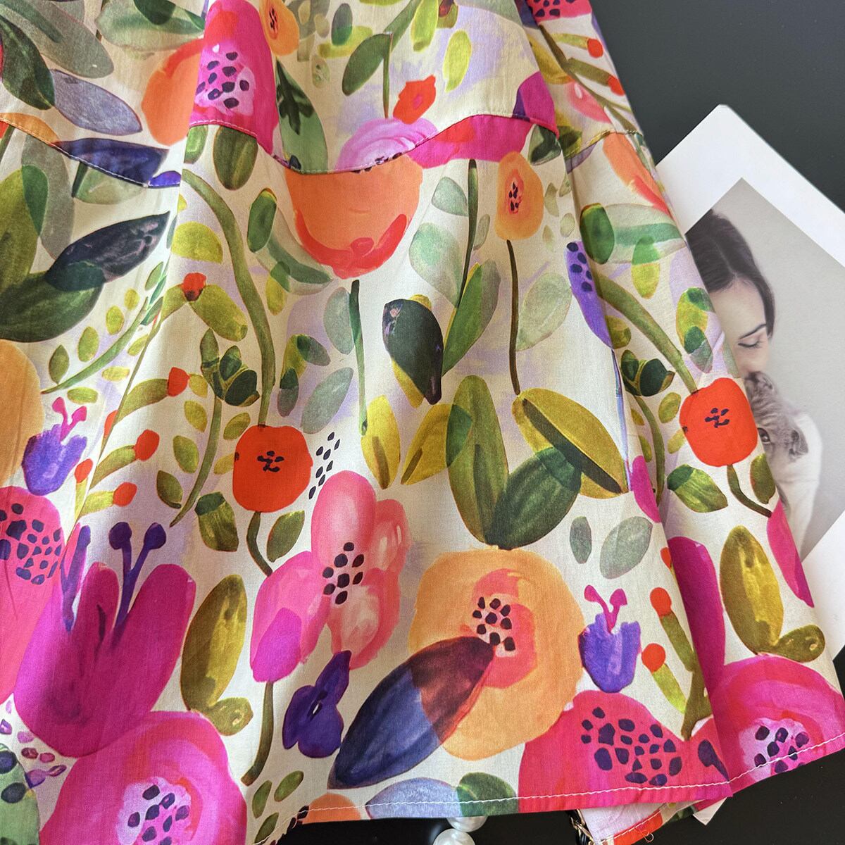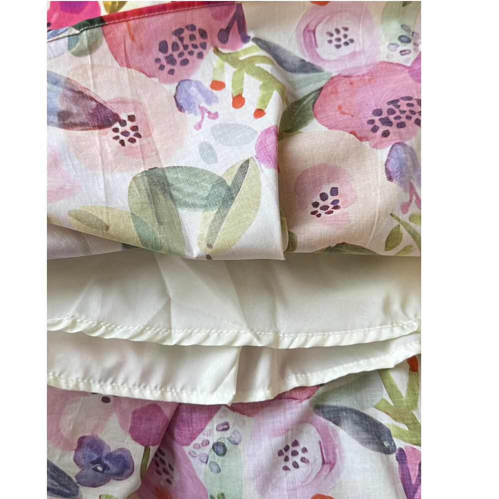 まるでアートのようなオイルペイント風フラワー柄が魅力のミディスカート。