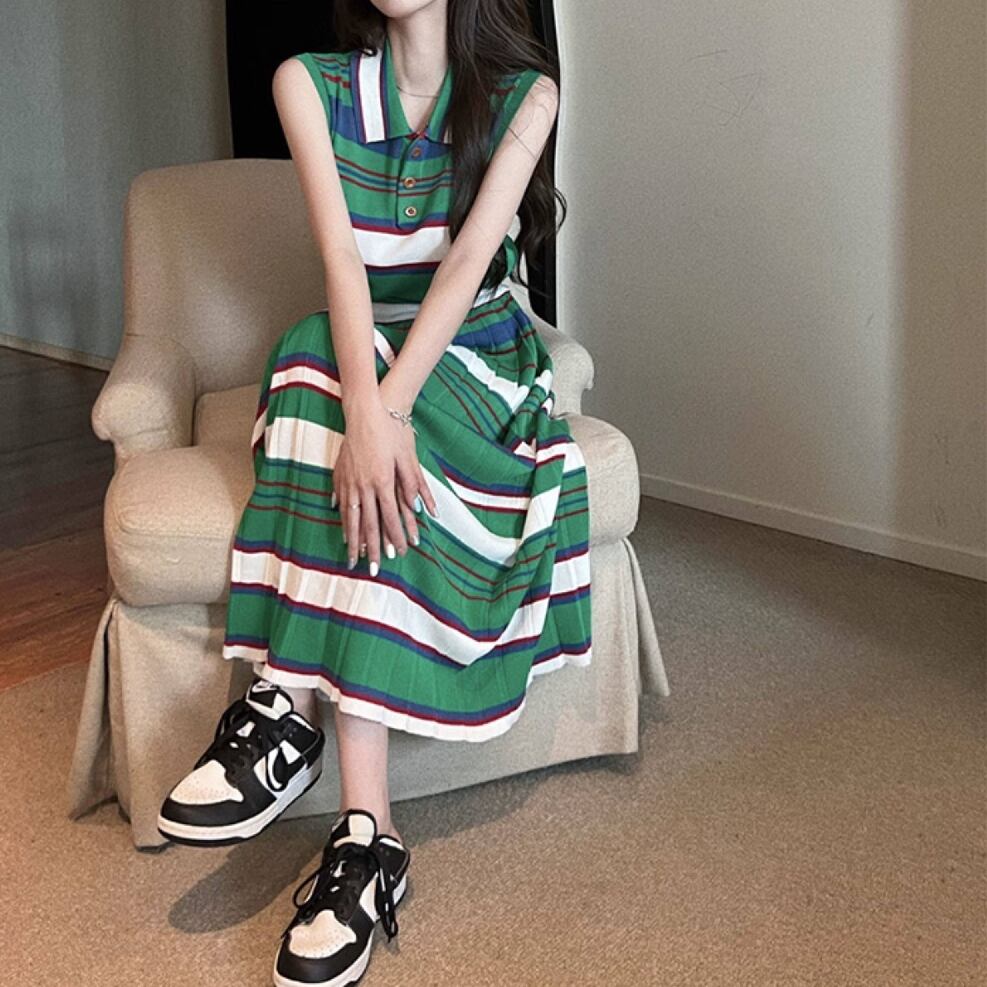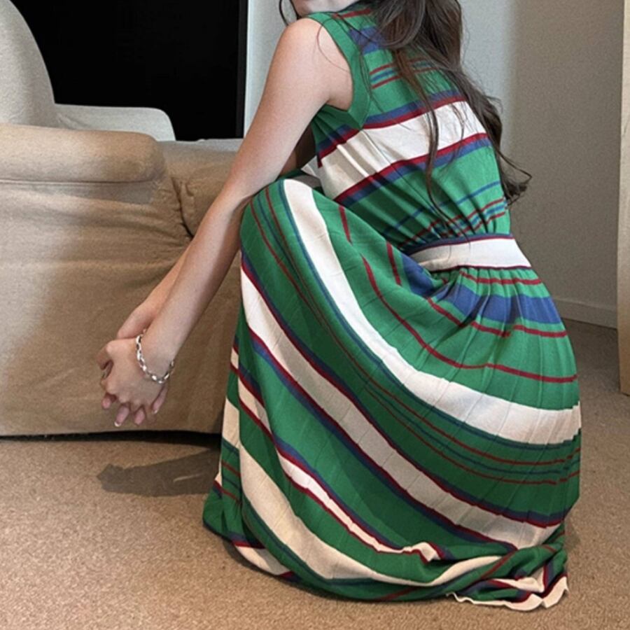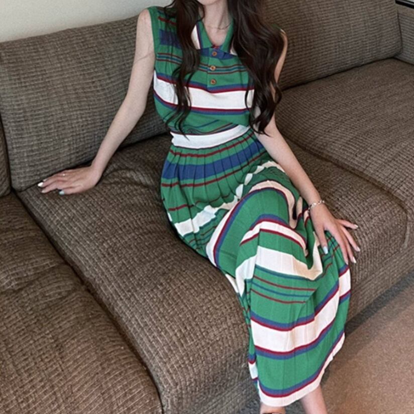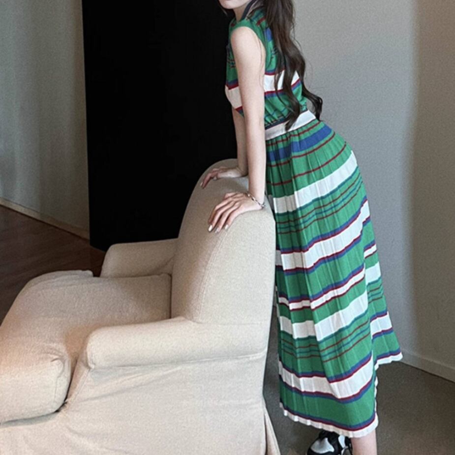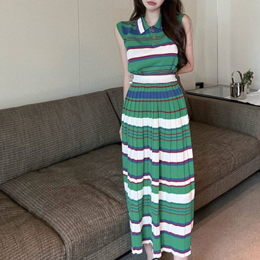 green striped sleeveless top and skirt set〈sk1540〉