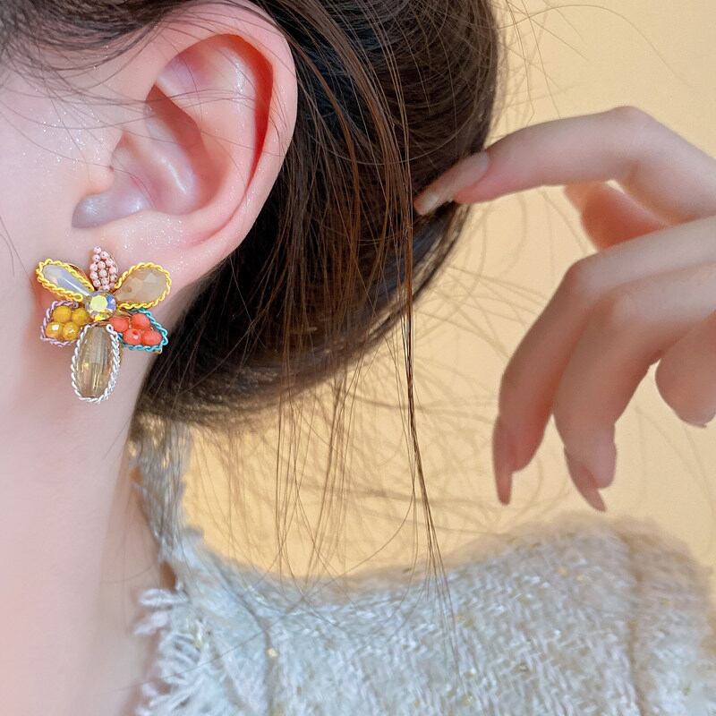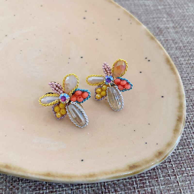 小さな花にカラフルなクリスタルをあしらった、可憐なピアス。