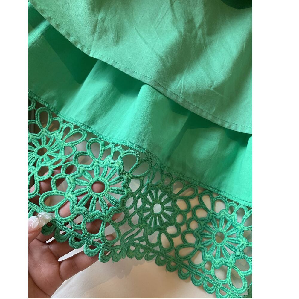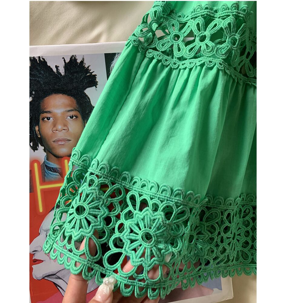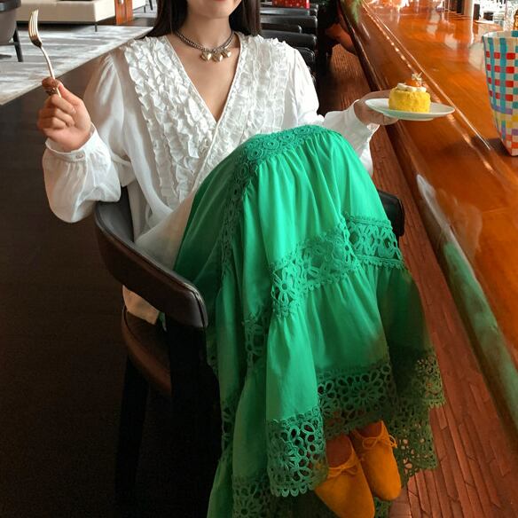 上品なグリーンカラーにカットアウトを施した、Aラインシルエットのスカート。