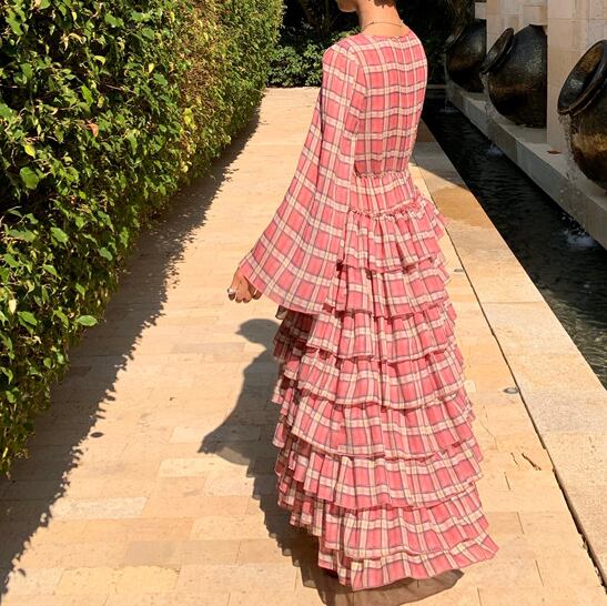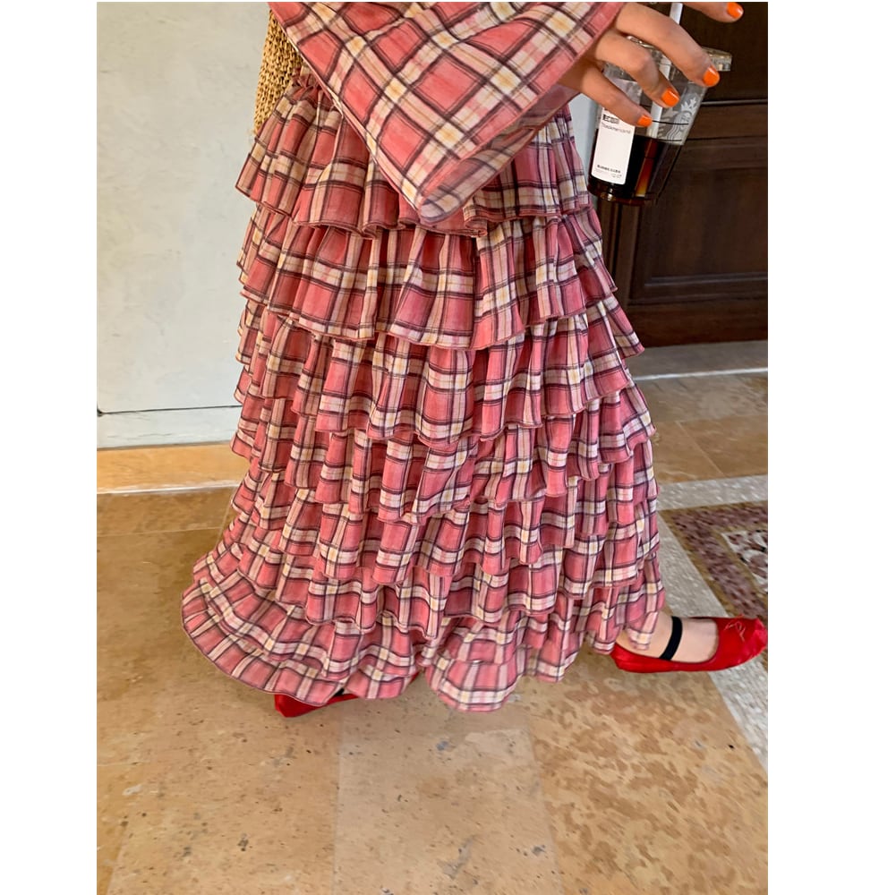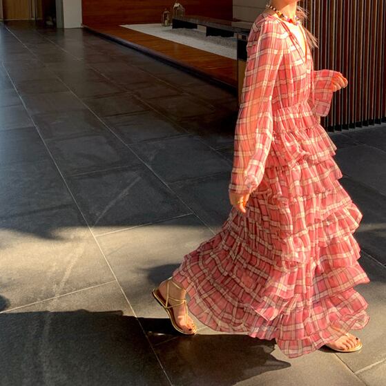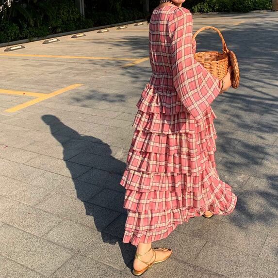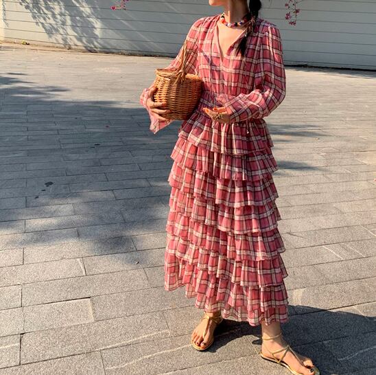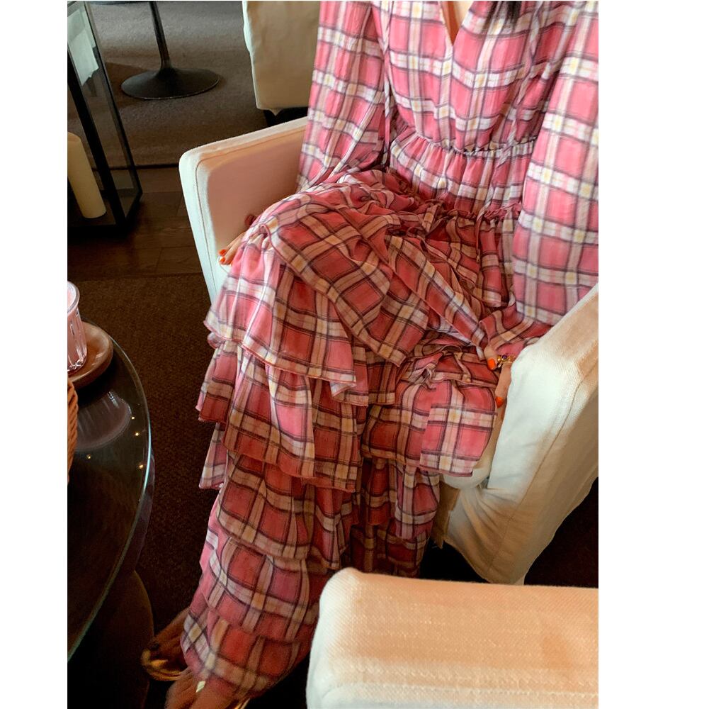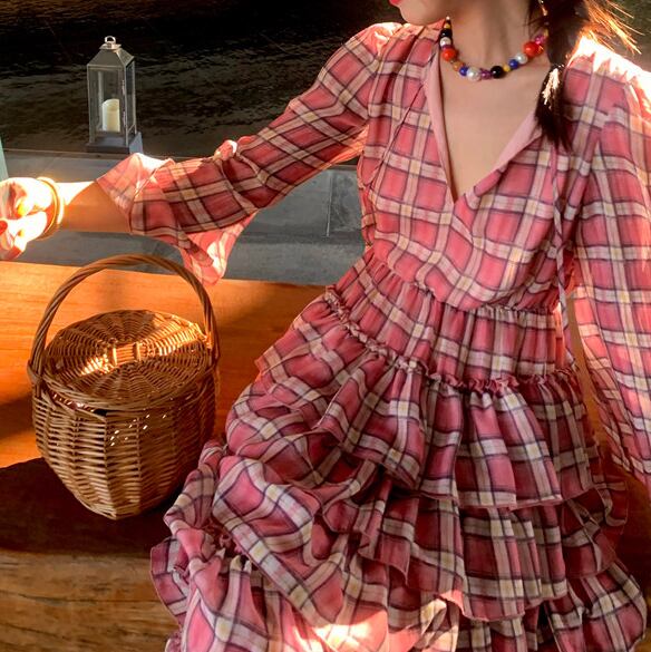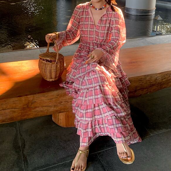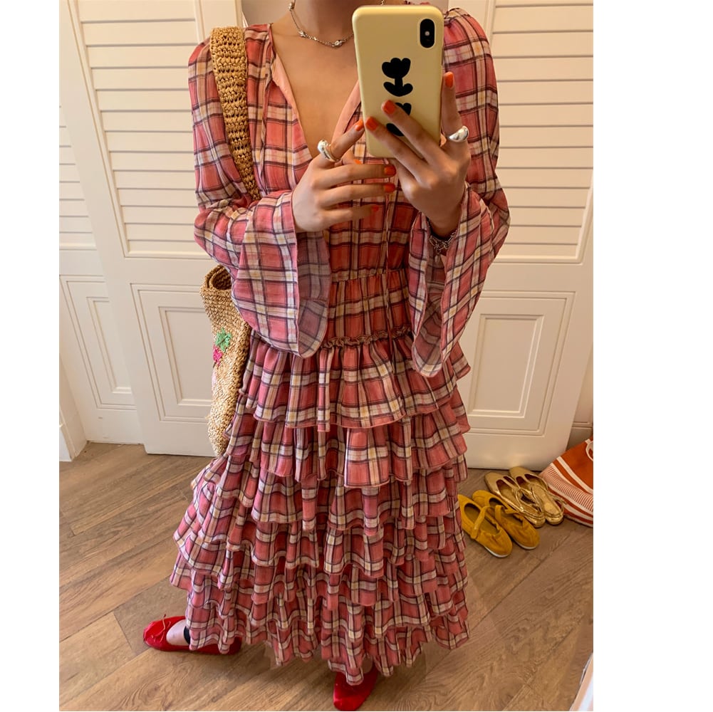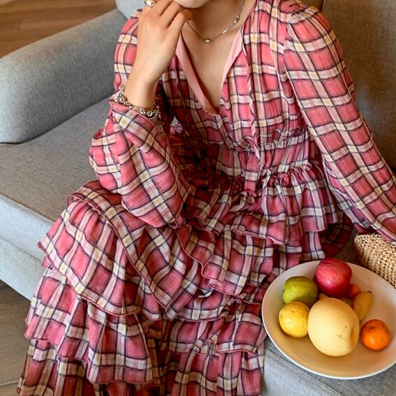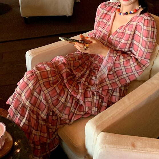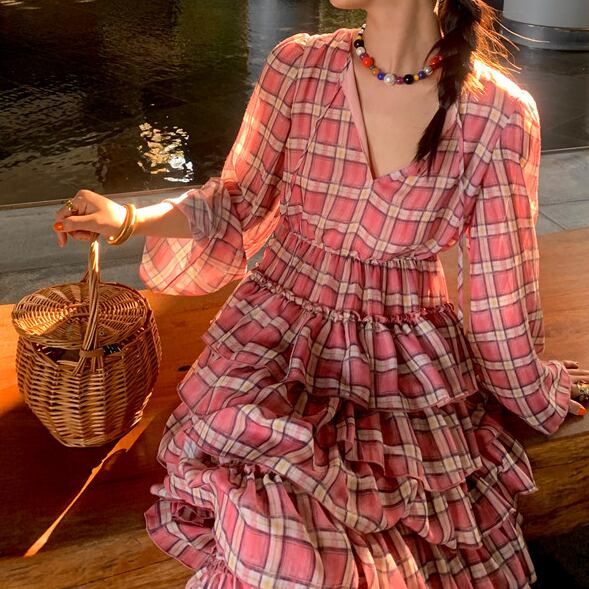 plaid chiffon tiered midi dress〈d1557〉