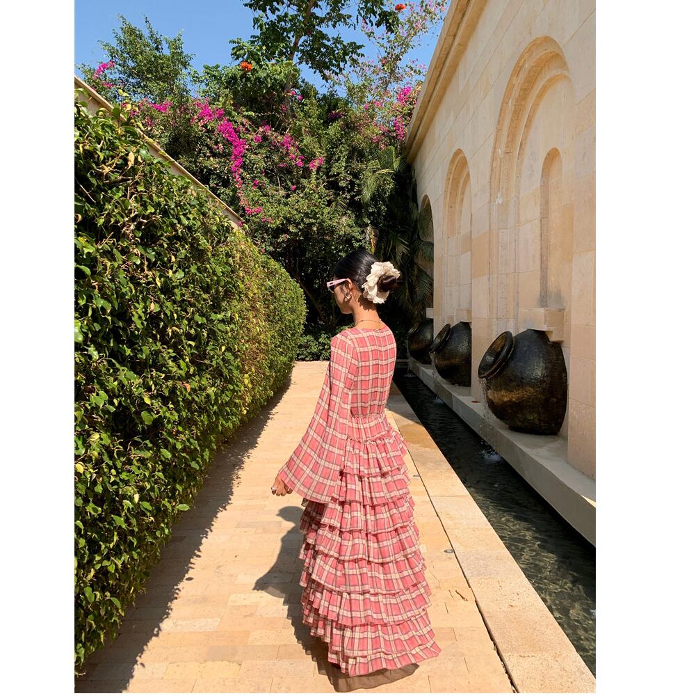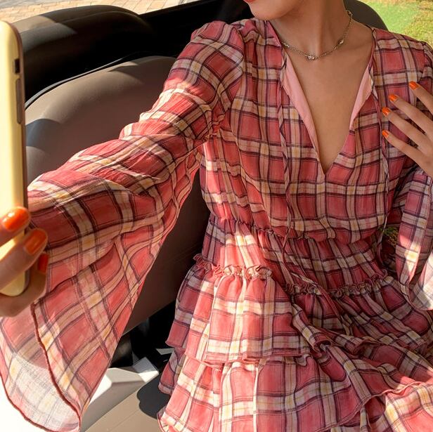 軽やかなシフォンにチェック柄をあしらった、ティアードワンピース。