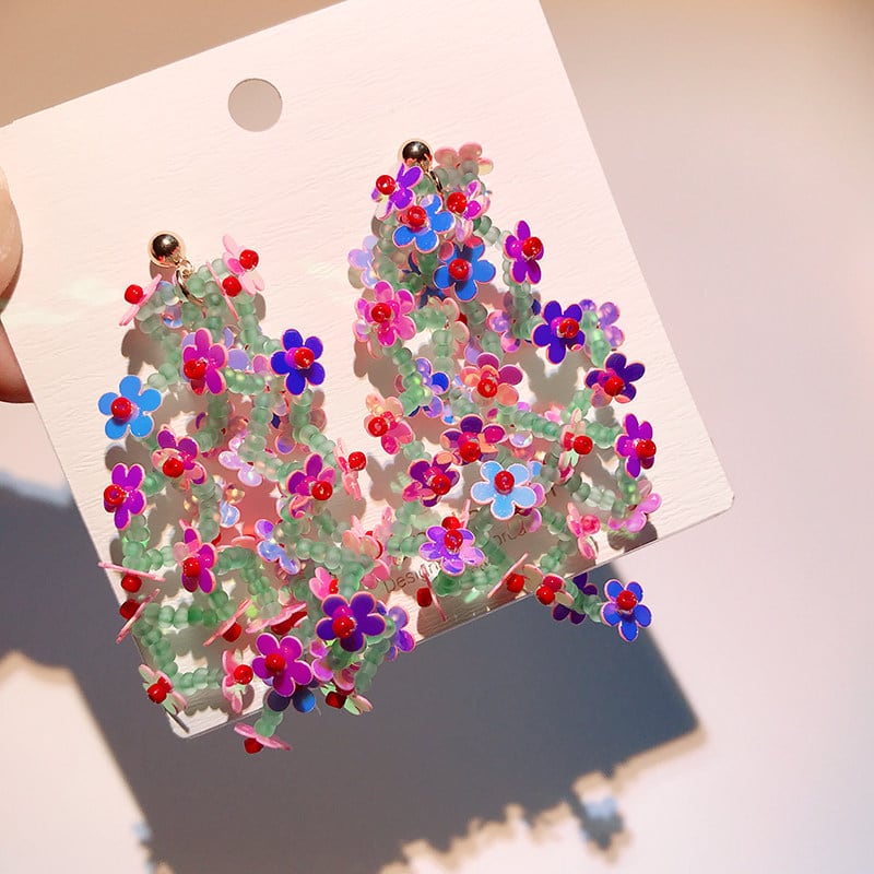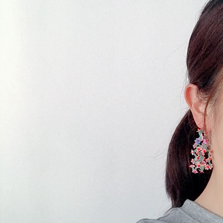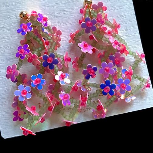 カラフルなフラワーモチーフにタッセルをあしらった、華やかなピアス。