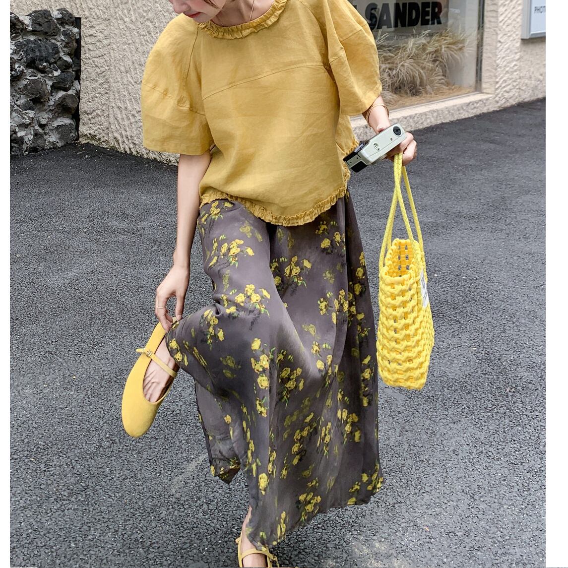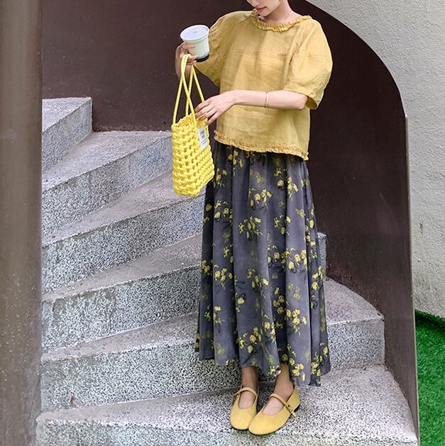floral ruffle blouse and skirt two piece set<ts1589>