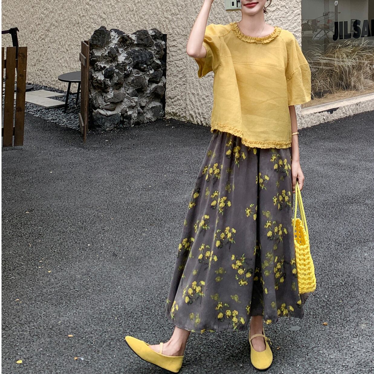 ふんわり揺れるフリルトップスと優しいフラワー柄のスカートが魅力のセットアップ。