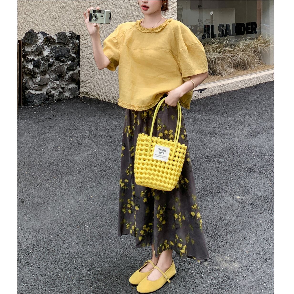 ブラウスとスカートの組み合わせで、統一感のある愛らしいスタイリングが完成します。