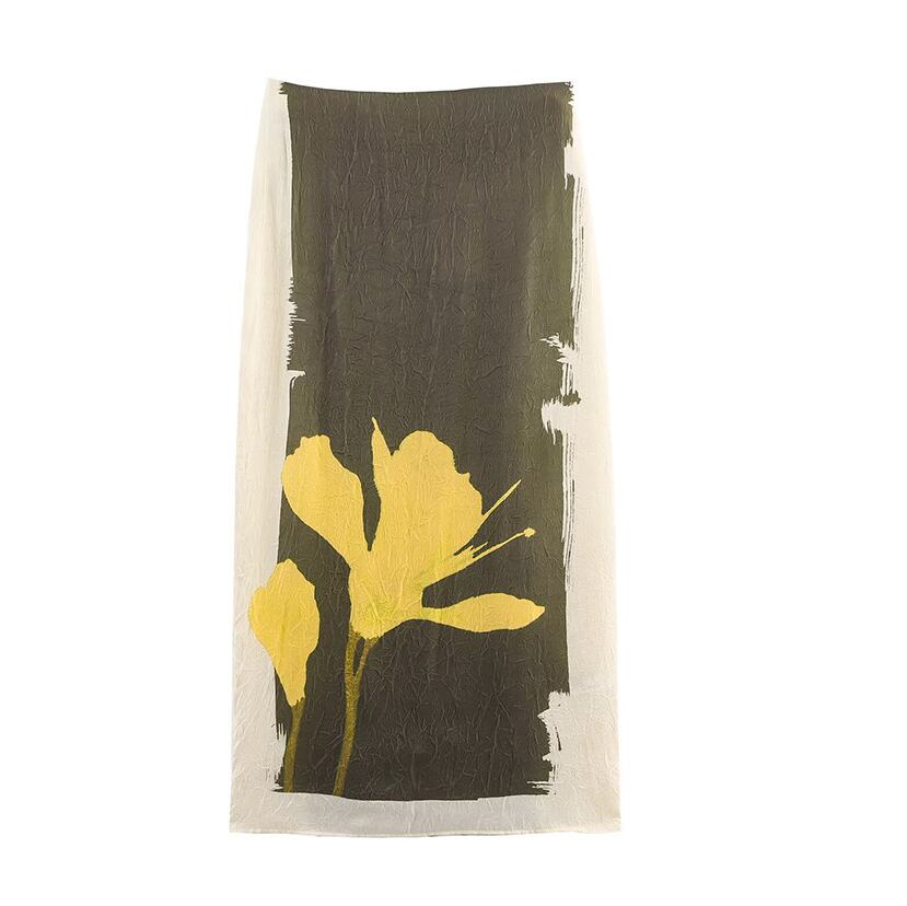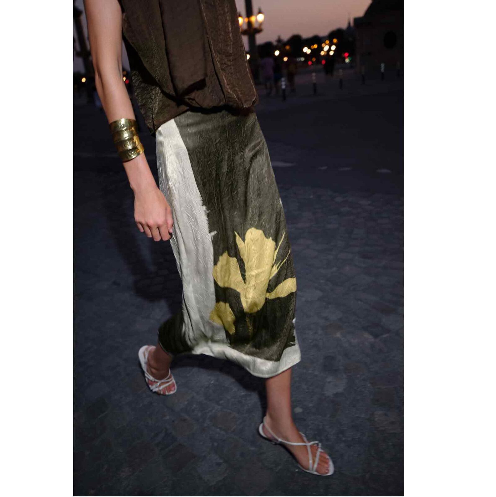 フラワー柄に、ルーシュで表情を加えたハイウエストスカート。