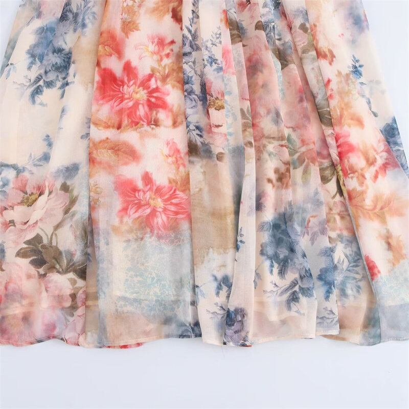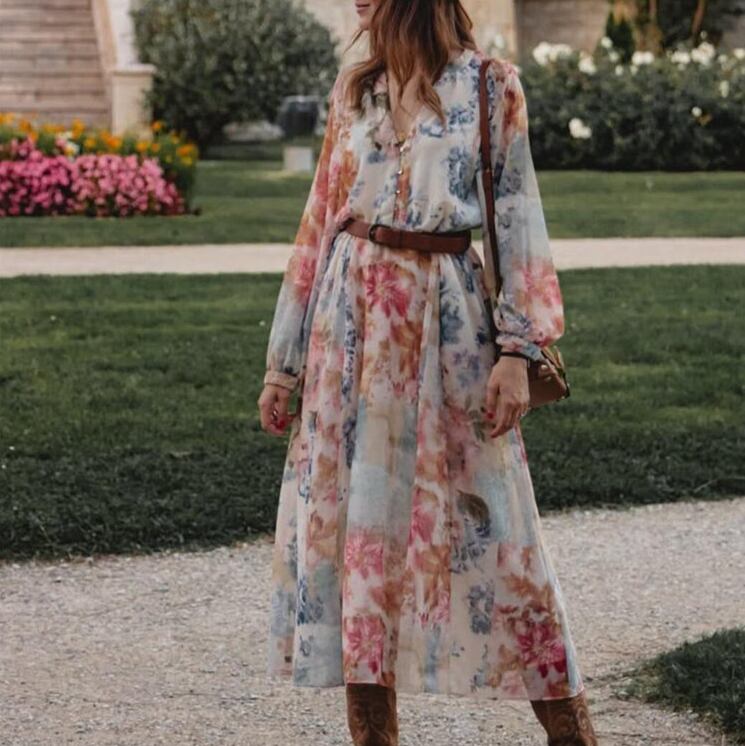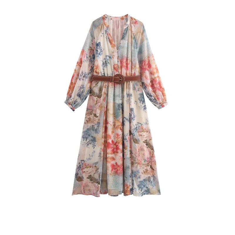フラワープリントにVネックを合わせた、抜け感のあるワンピース。