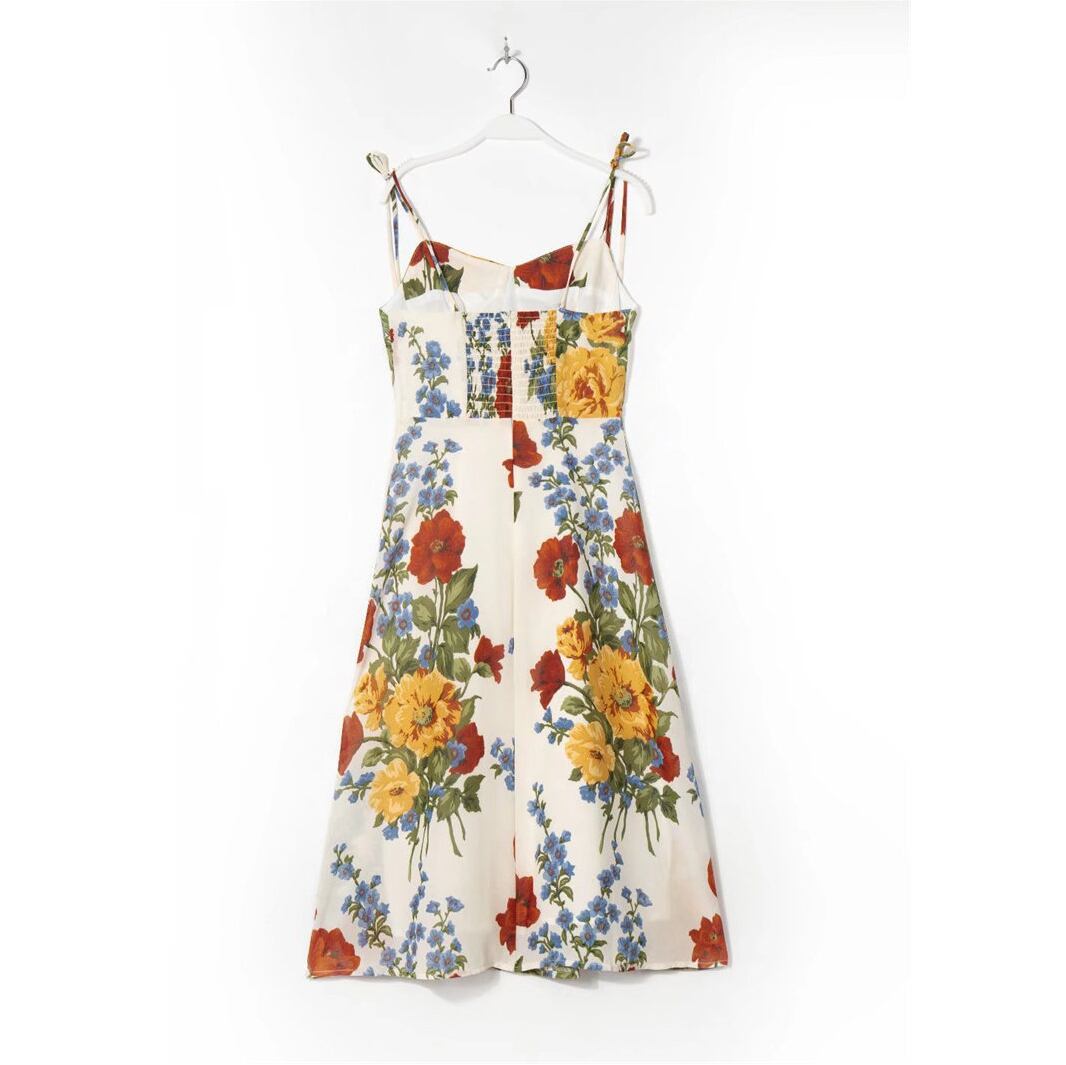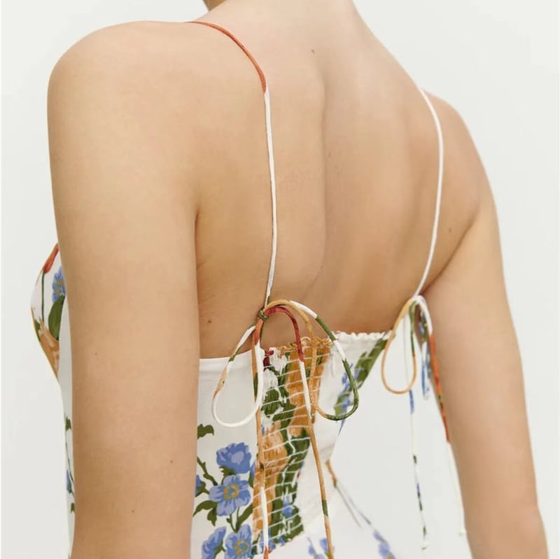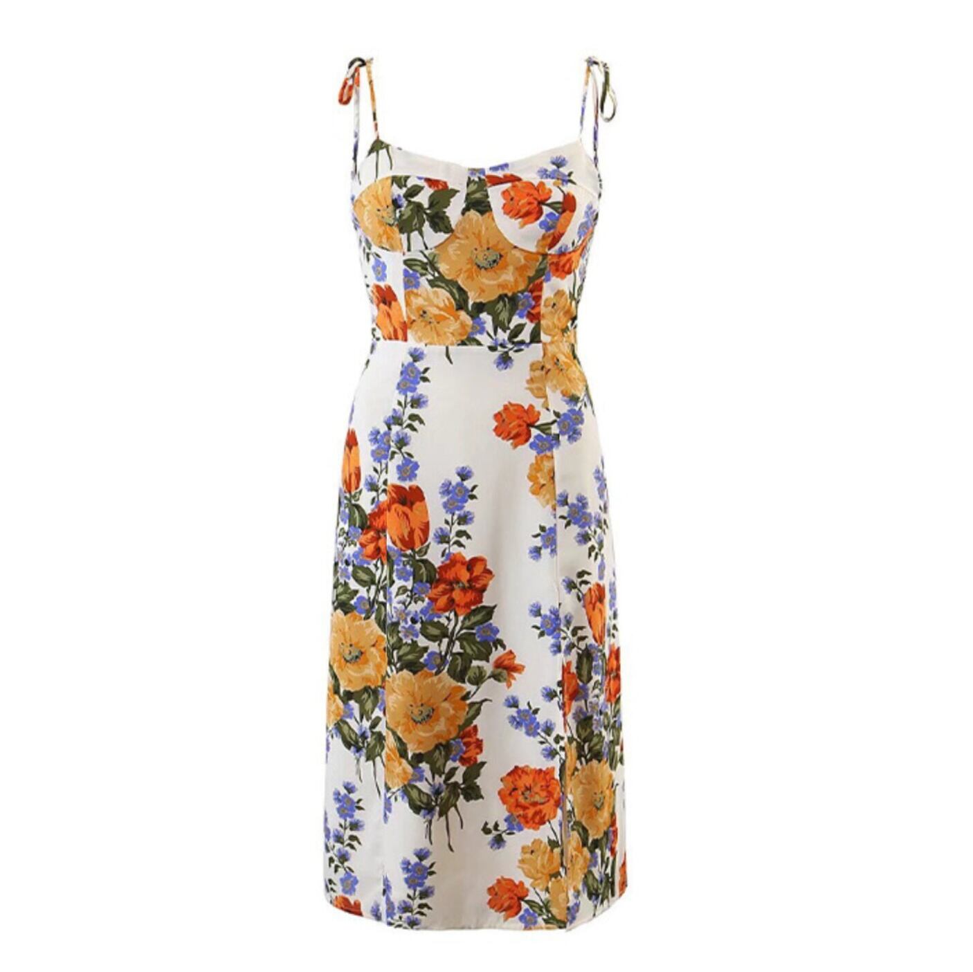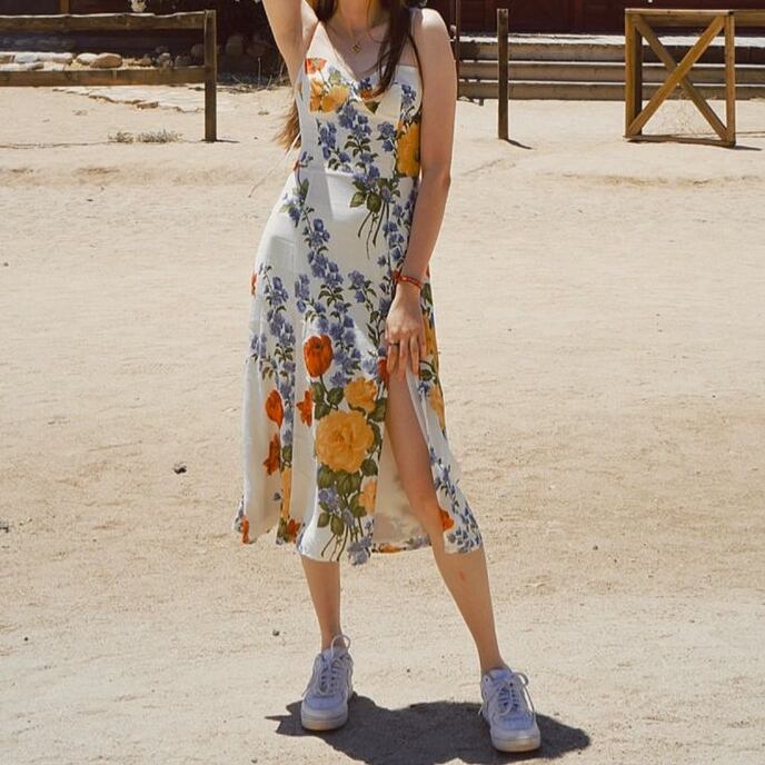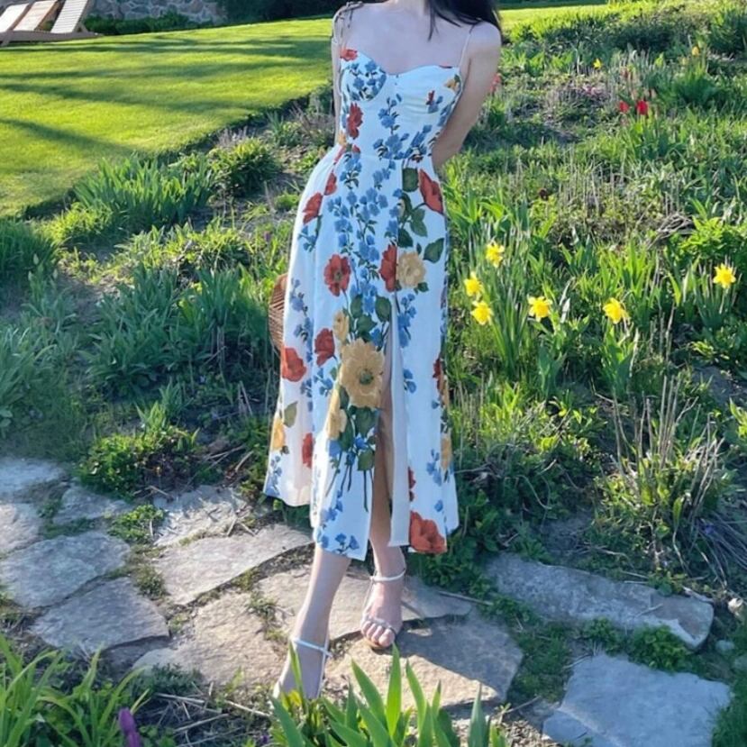フラワー柄に大胆なスリットを組み合わせた、ストラップマキシドレス。