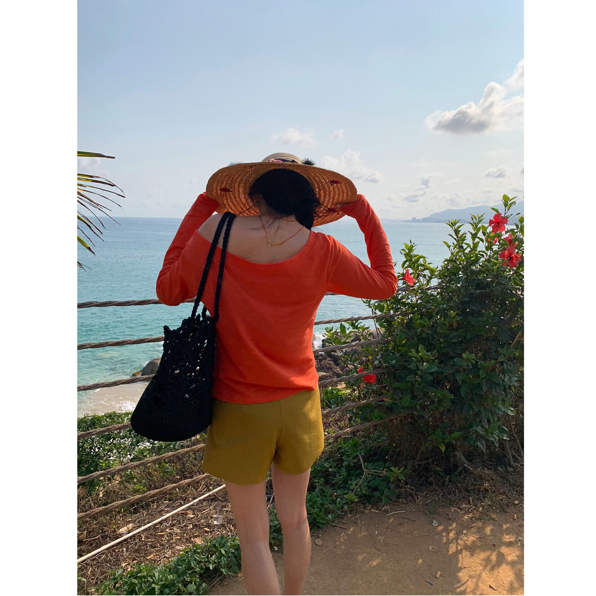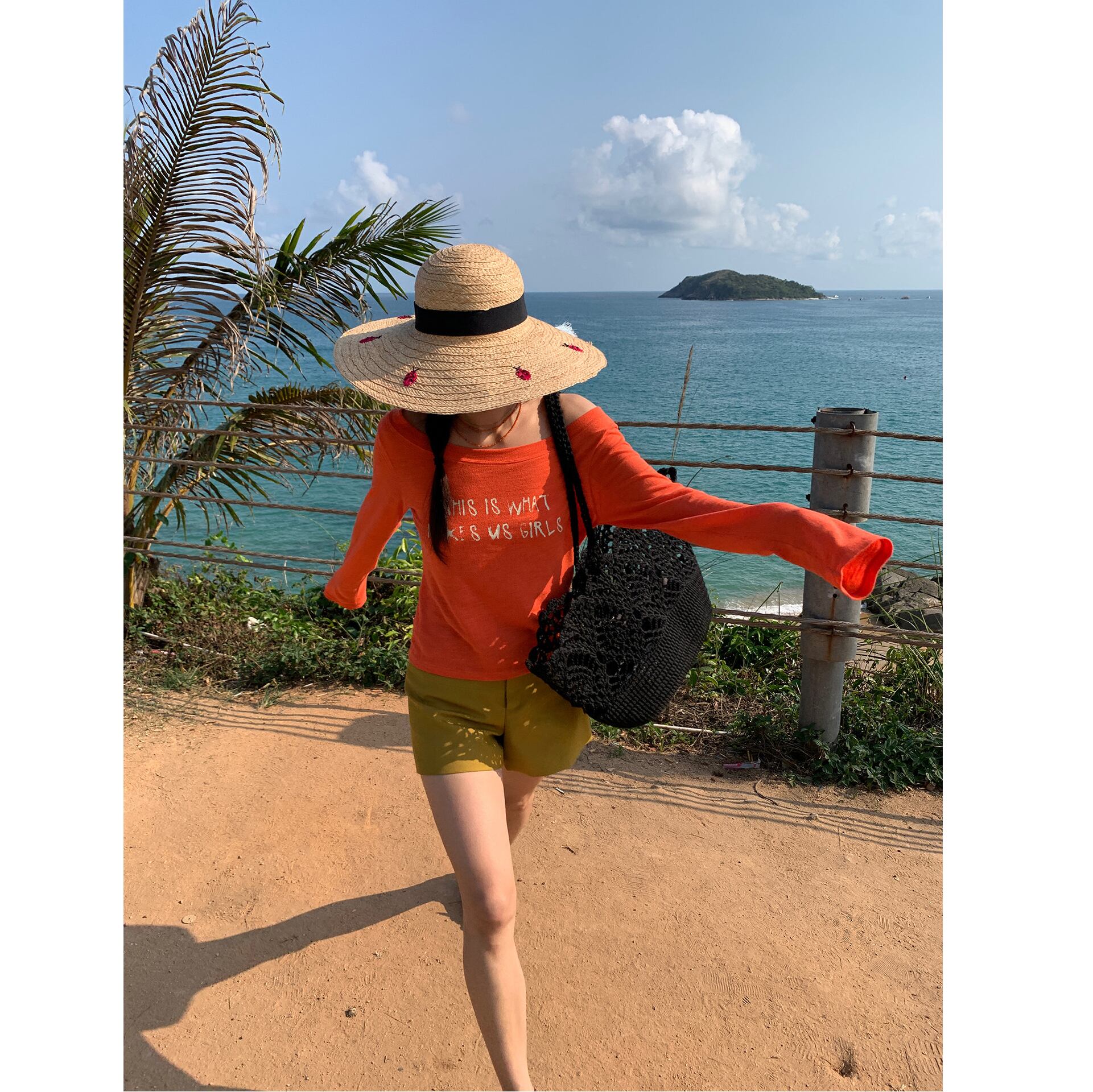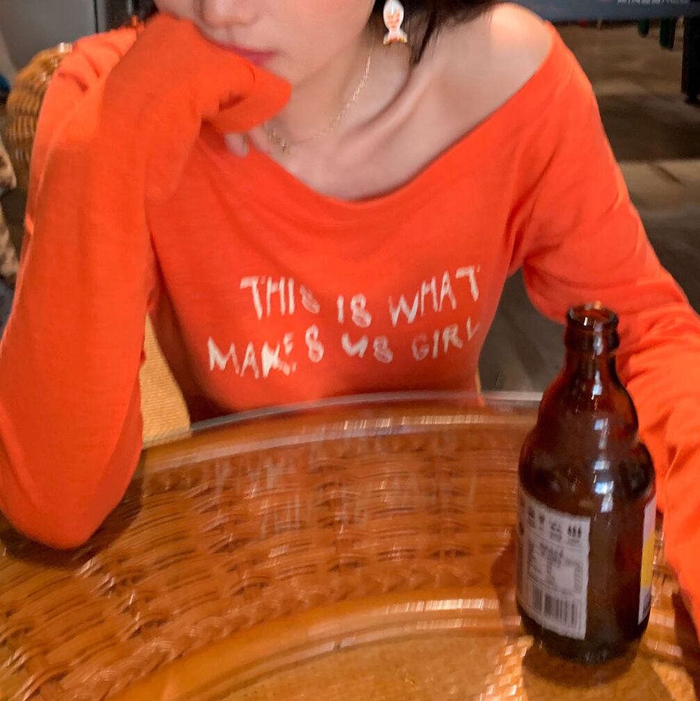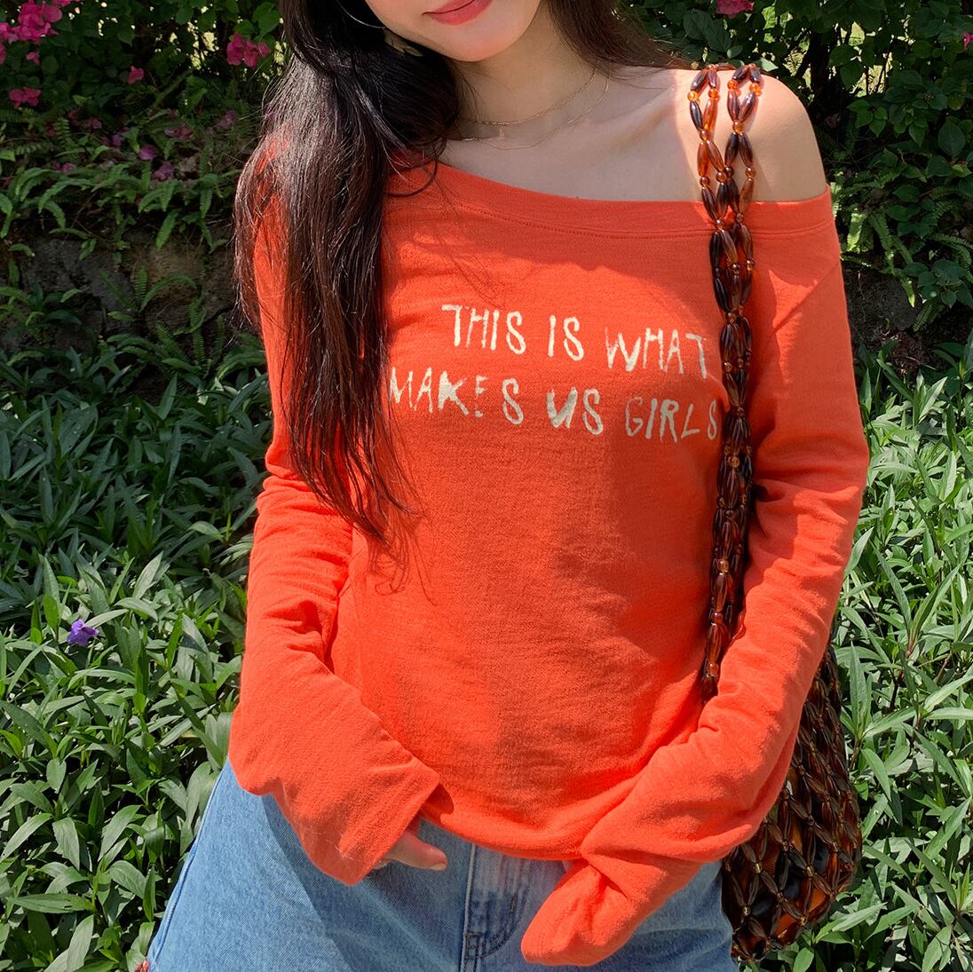 orange off shoulder asymmetrical long sleeve top<t1602>
