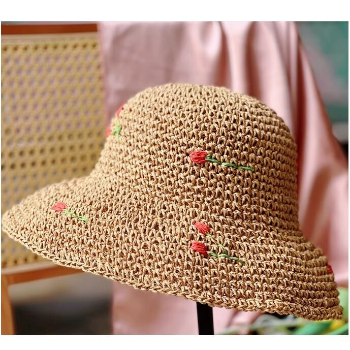 クロシェチェリー柄が素敵な、woven straw hat with crochet cherry pattern。
