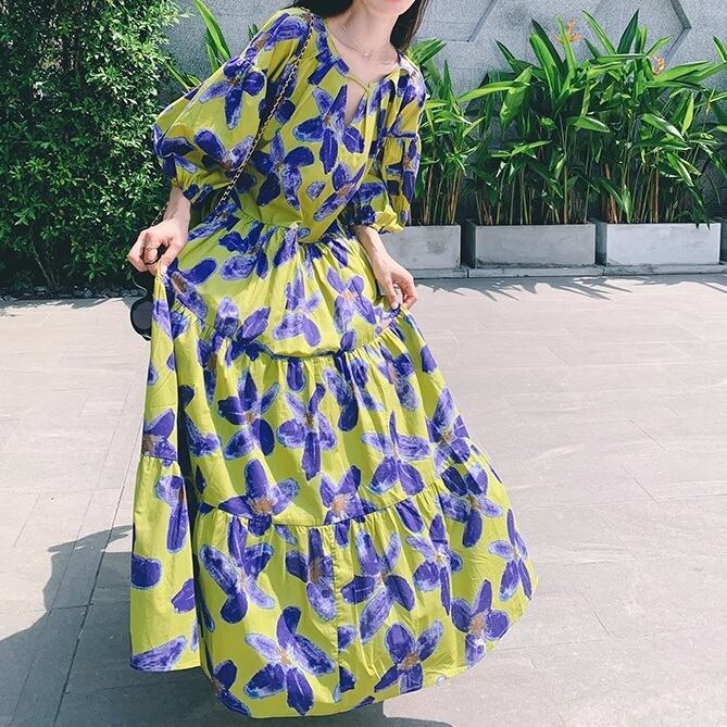 爽やかなグリーンと美しい花柄が目を引く、green flowers puff sleeve one-piece 。