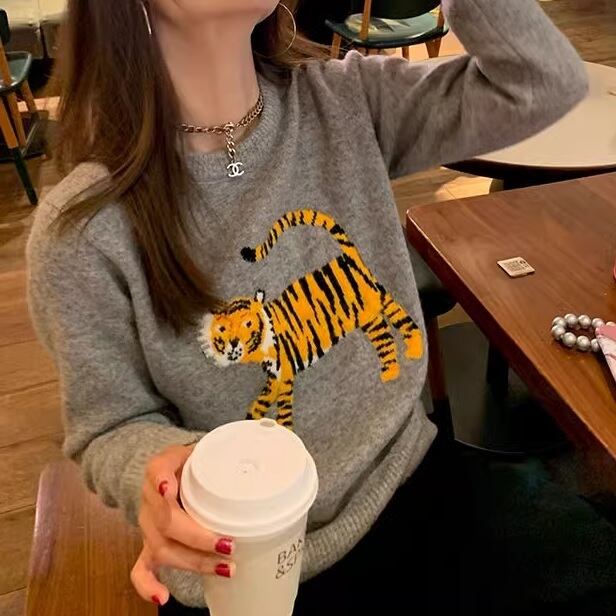 シャープでユニークなtiger embroideryが目を引くknit top。