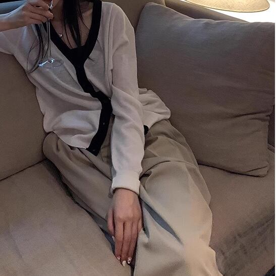 シックで洗練された印象を与えるbi-color knit cardigan。