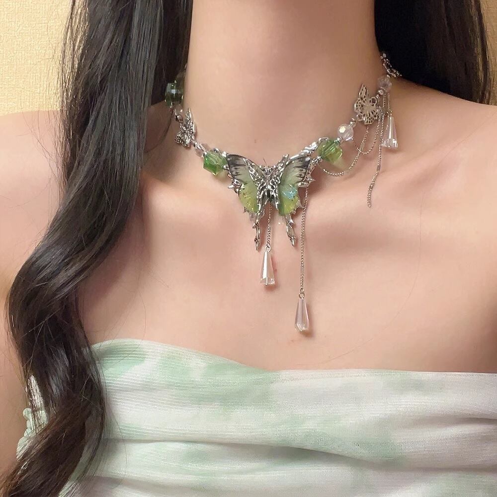 繊細な蝶のモチーフと氷のようなクリスタルが織り成すgreen ice crystal butterfly choker。