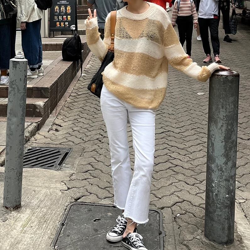 カジュアルなstriped knit mesh sweater top。