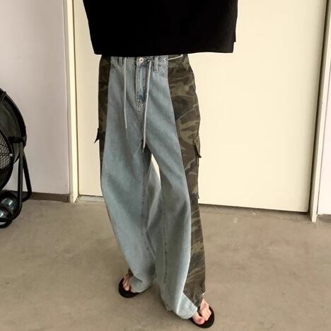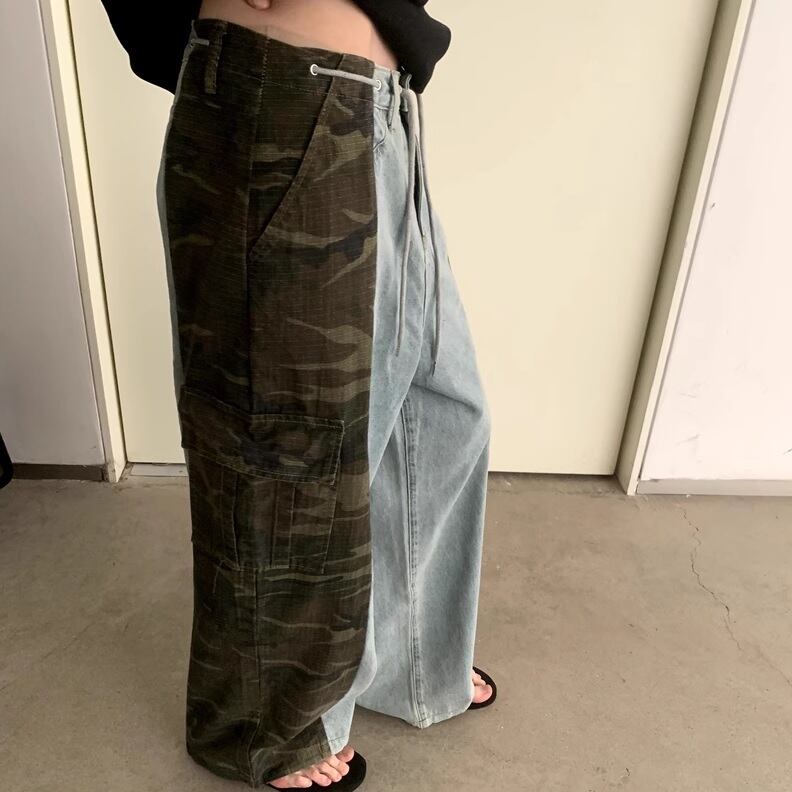 スタイリッシュなpatchwork drawstring denim wide-leg pants。