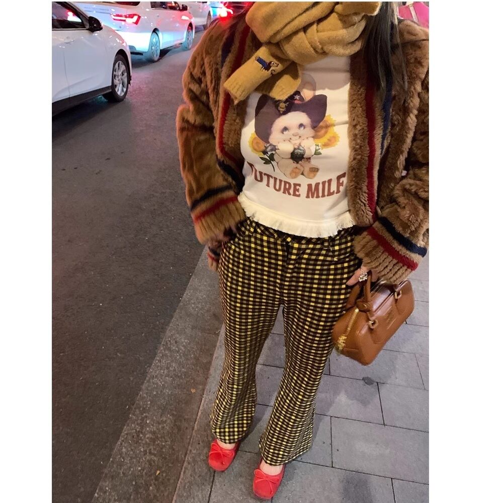 yellow checked flare pants 〈p101741〉