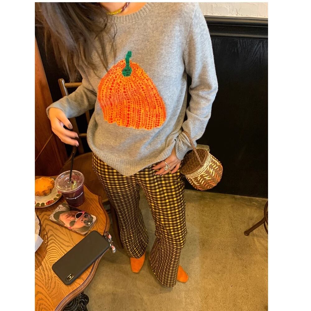 温かみあるyellow checked flare pants 。