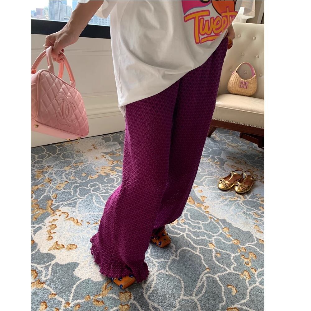 ポップな色合いが目を引くpurple knit pants 。