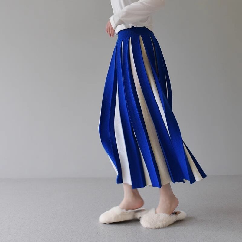 シンプルながら存在感のあるcolor block pleated A-line skirt。