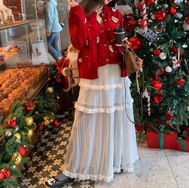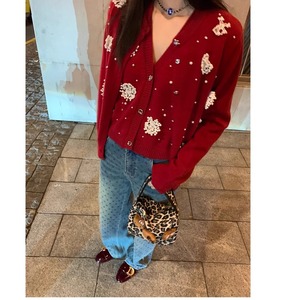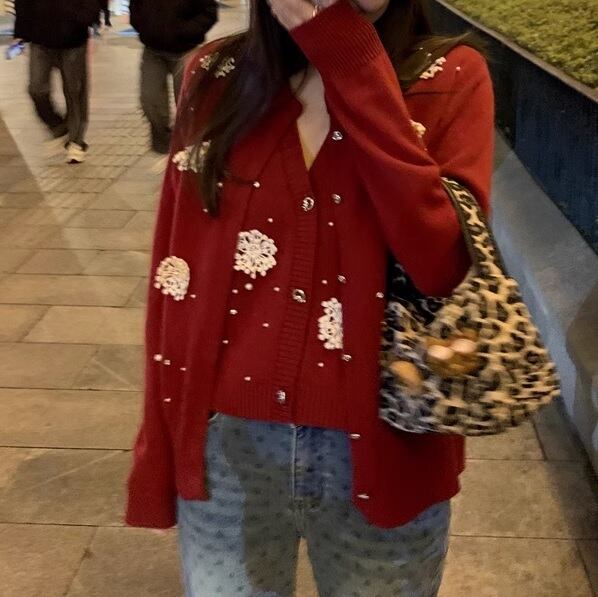 大人可愛いknit top & cardigan with pearl embellishments set。