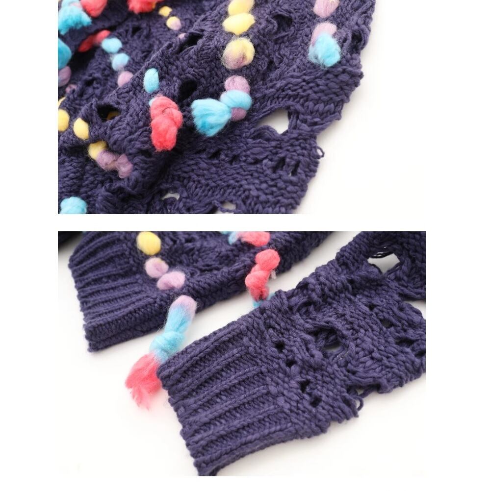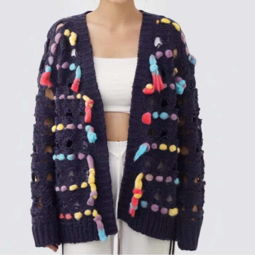 大人カジュアルなopen-knit cardigan woven with colorful strings。